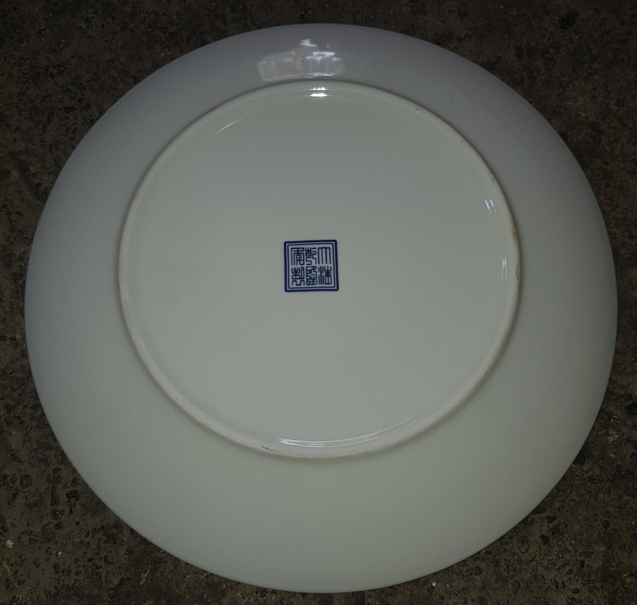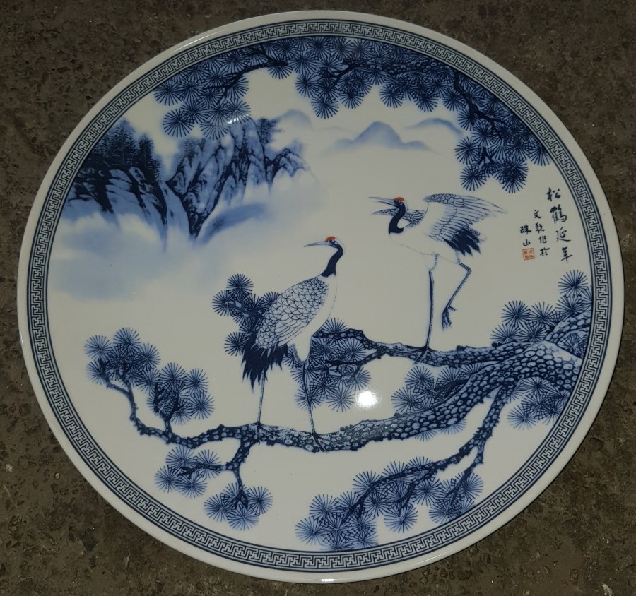 Vạn cổ thanh Tùng xuân bất lão / Thiên thu bạch Hạc thọ vô cương... Đĩa đường kính lớn họa pháp Tùng Hạc Diên Niên với đường kính 35.5cm. cổt dầy và nặng. GL790k