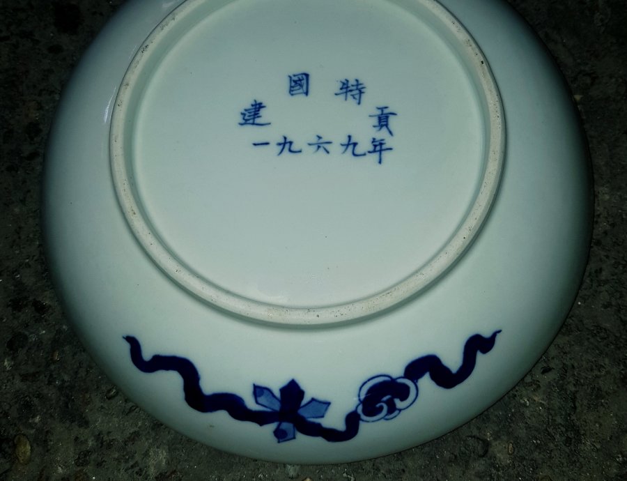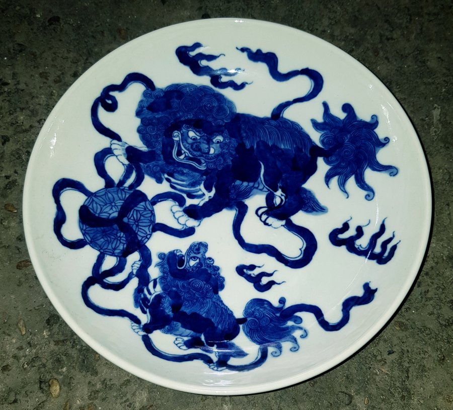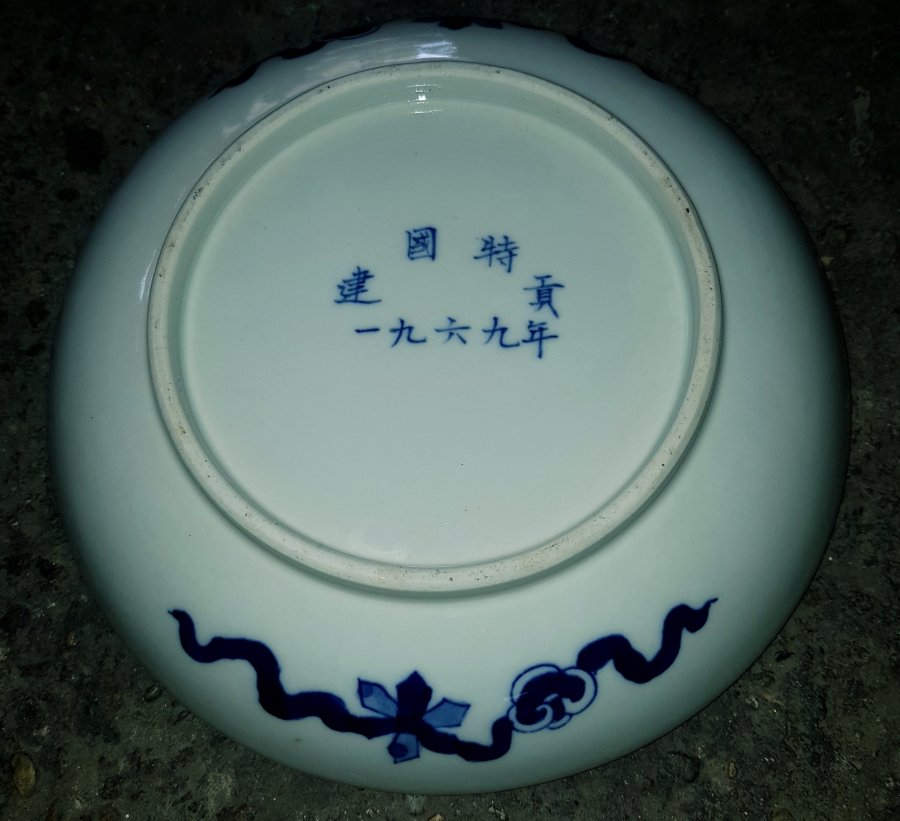 Đĩa sứ men lam họa pháp nhị Lân vờn cầu đề 1969 Niên với đường kính 20.5cm. cao 4.5cm. lành lặn. GL950k