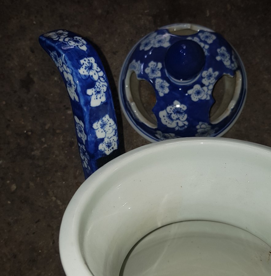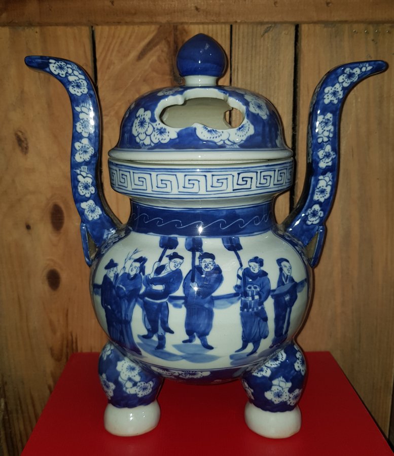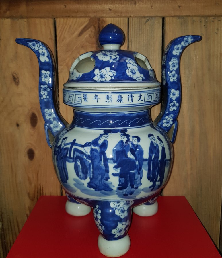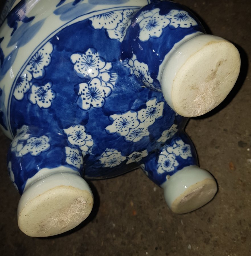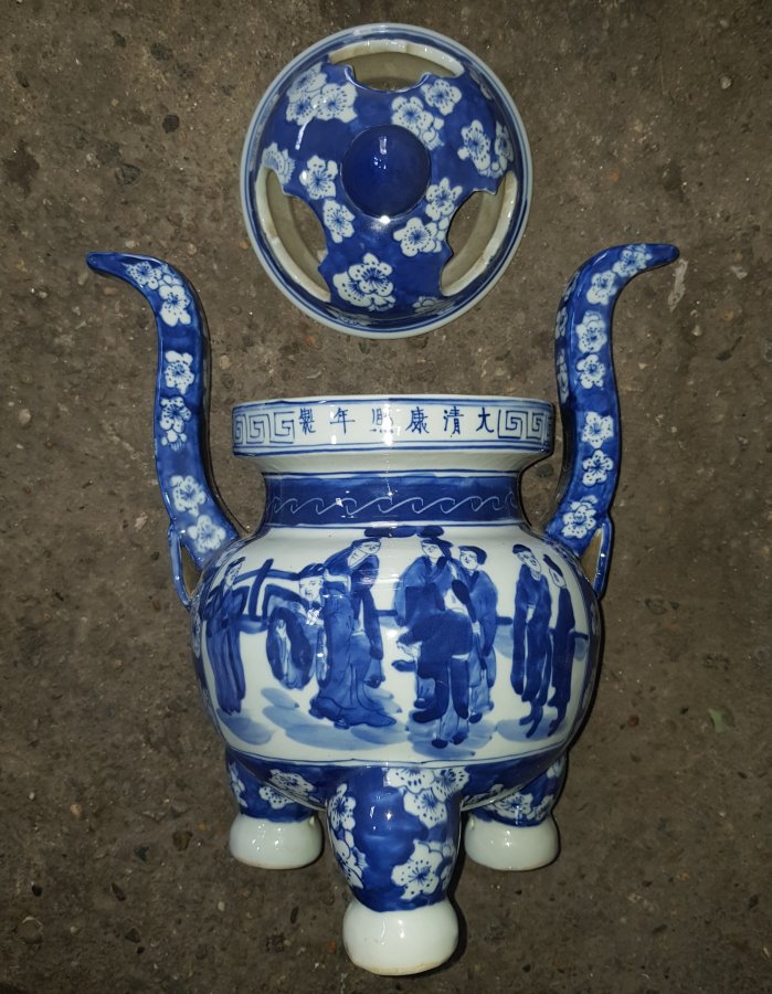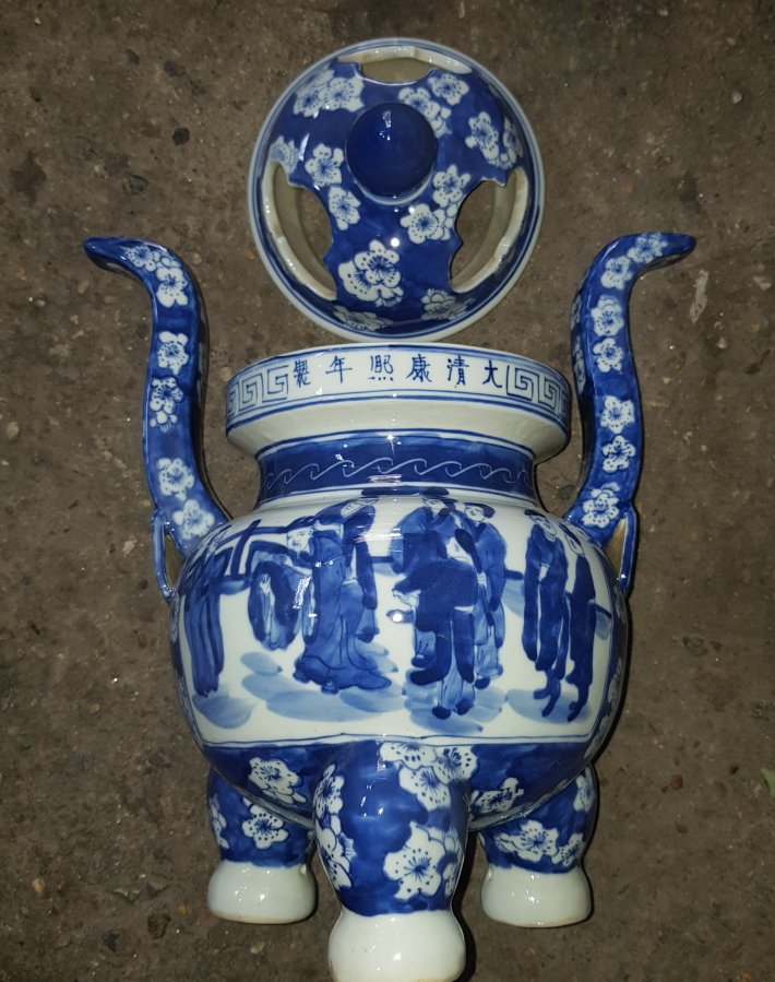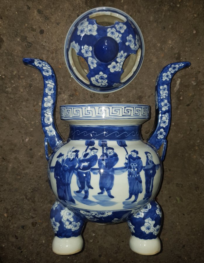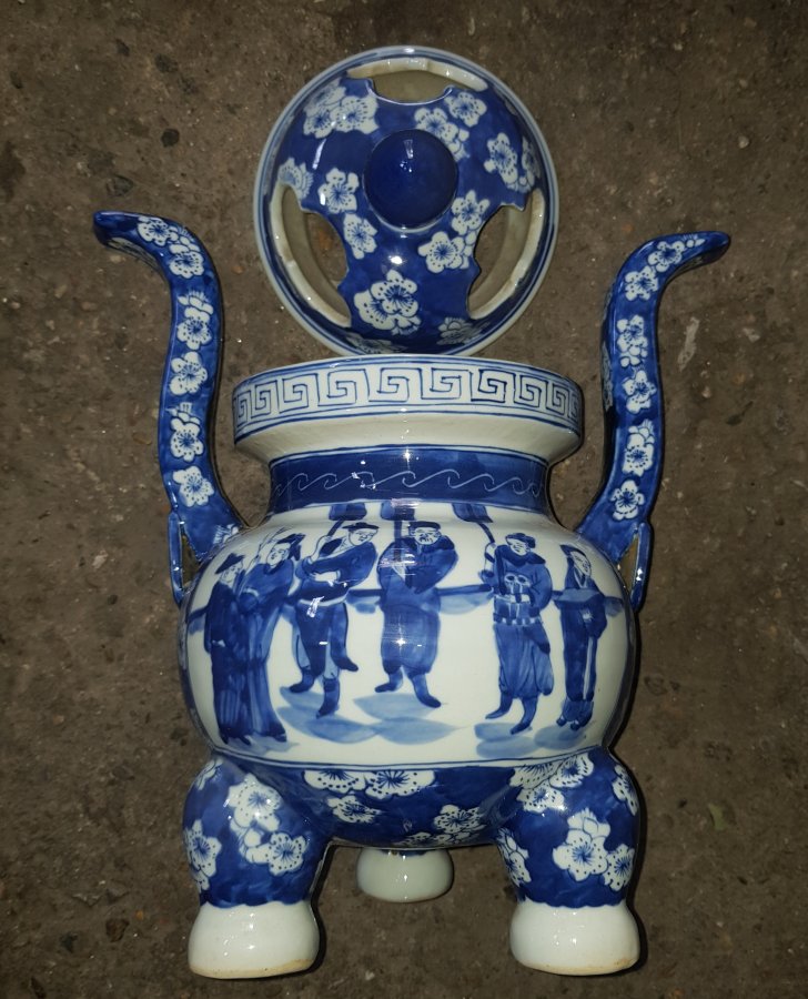 Đỉnh sứ men lam chàm hồi có họa pháp trên nền mai ẩn , đỉnh hài hòa vững chắc có chiều cao 33cm. miệng 15cm. vòng bụng 58cm. lành lặn. GL3550k
