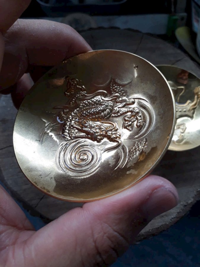 Đôi chén rồng cuốn thủy và chuột sa chĩnh gạo. Dáng lạ. Mạ vàng 24k. Lành.