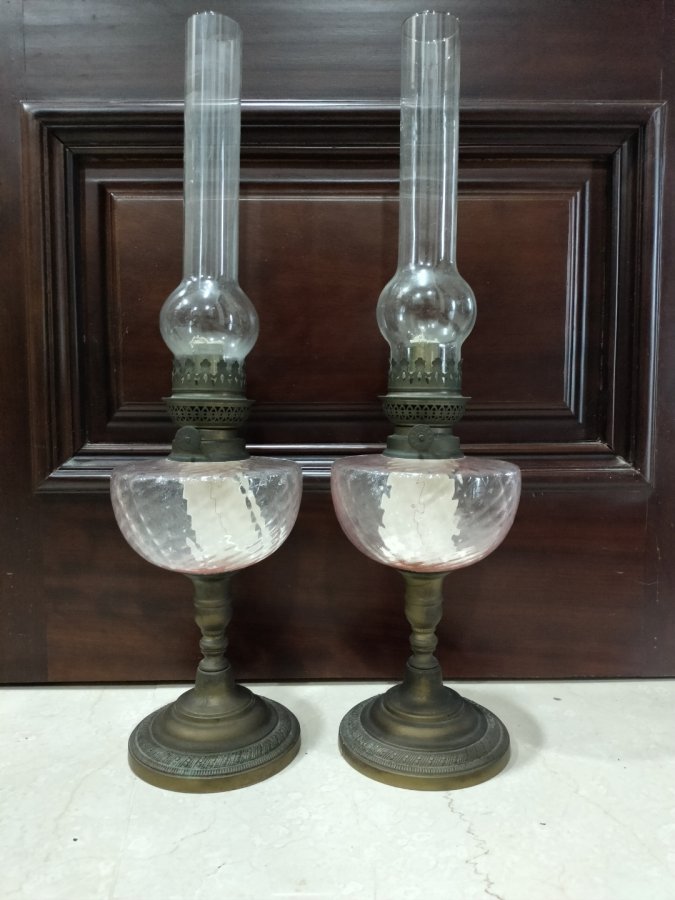 Đôi đèn dầu Pháp bầu mãng cầu màu hồng phấn. Kích thước bầu đường kính 14cm. Lành tít nguyên zin. Chân đồng hoa văn. Bóng zin xưa.