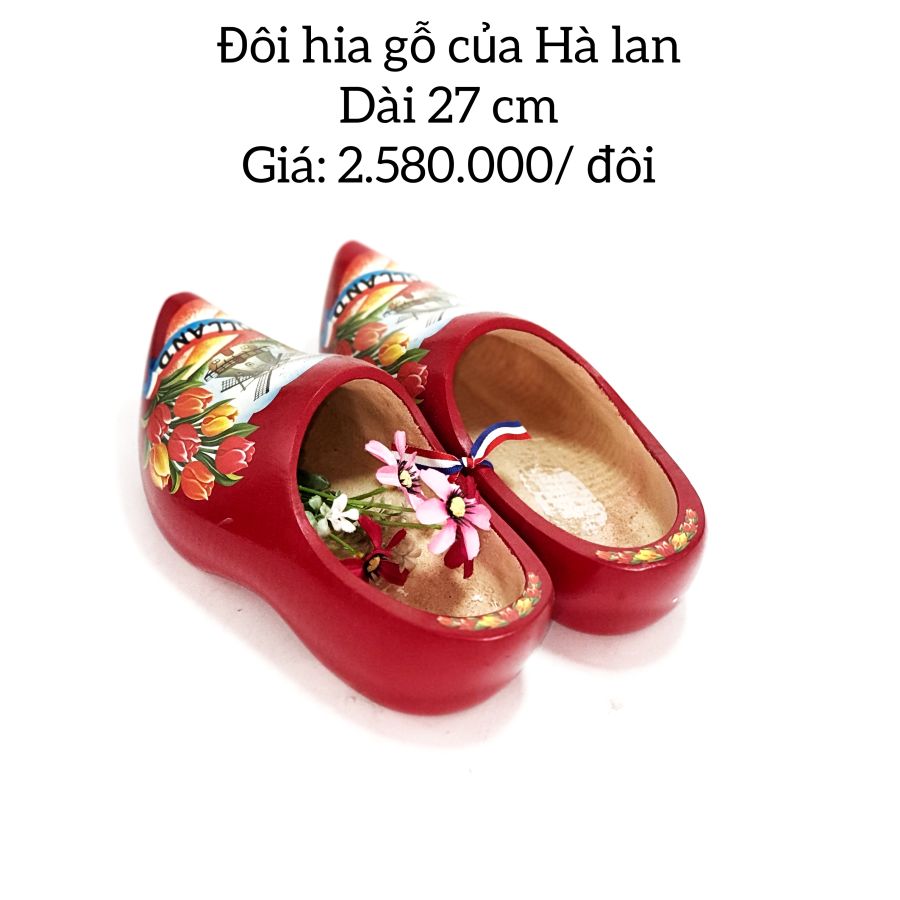 Đôi guốc gỗ màu đỏ với hoa Tulip và cối xây gió Hà Lan .