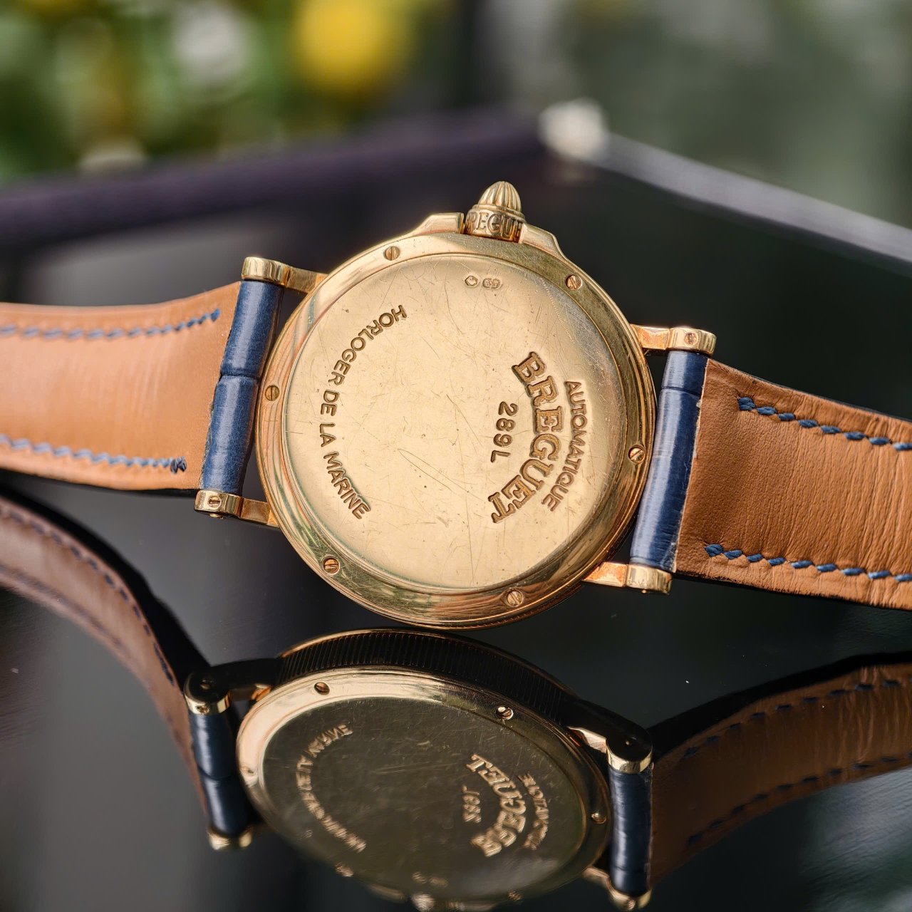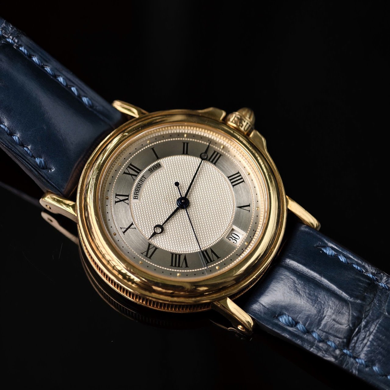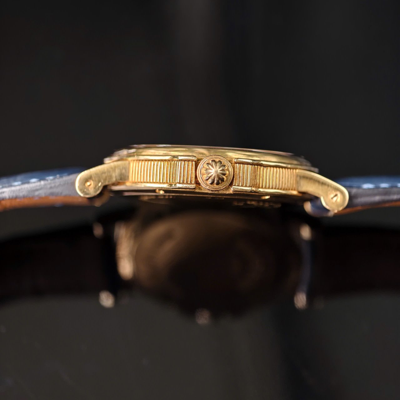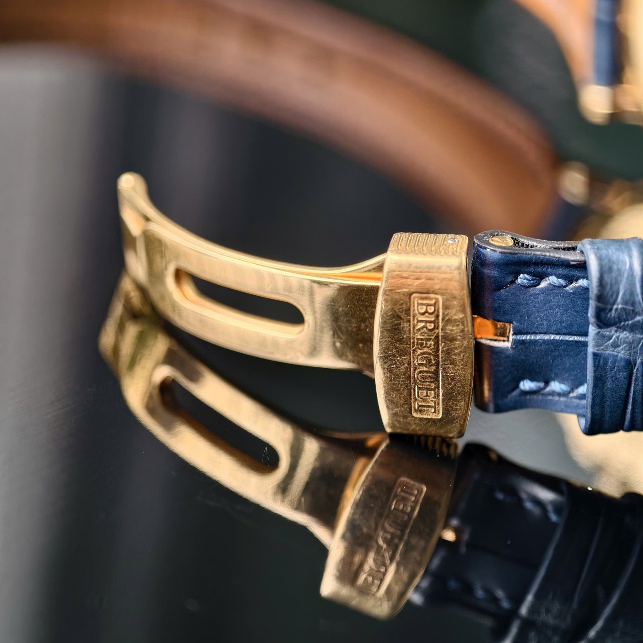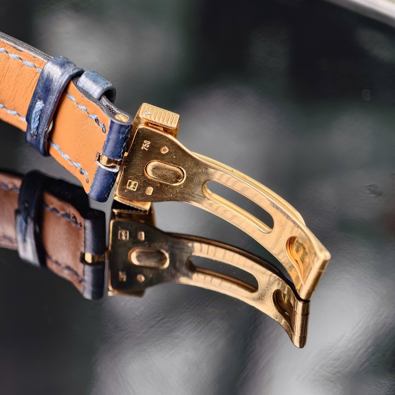 Đồng hồ được trang bị dây da khoá gập vàng đúc 18k, ôm gọn vào tay người đeo.