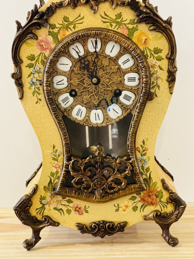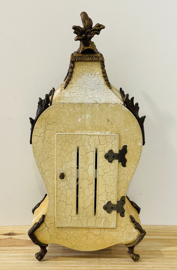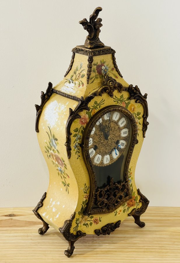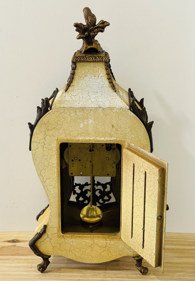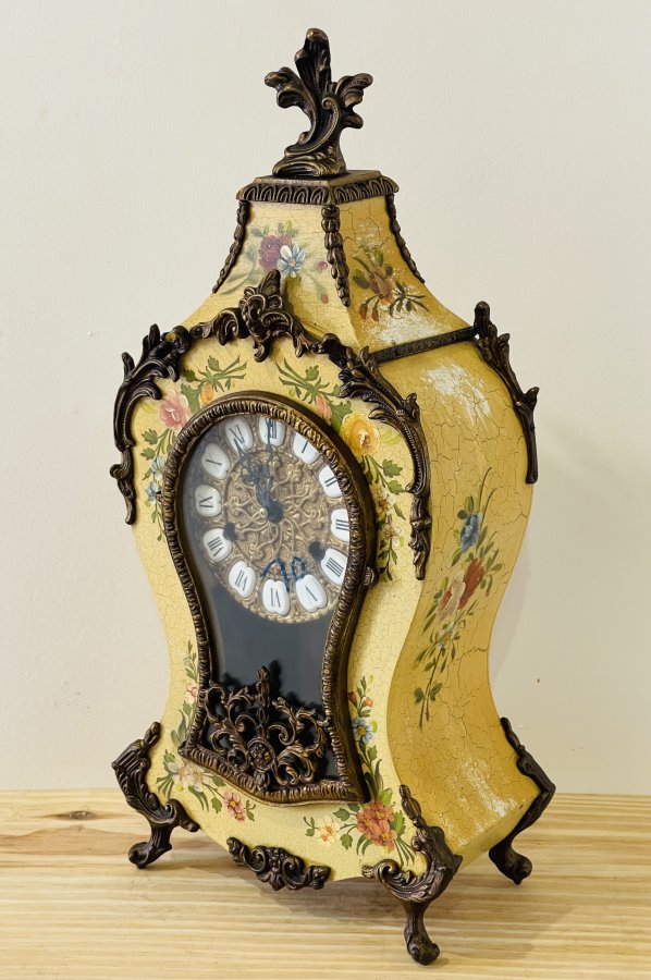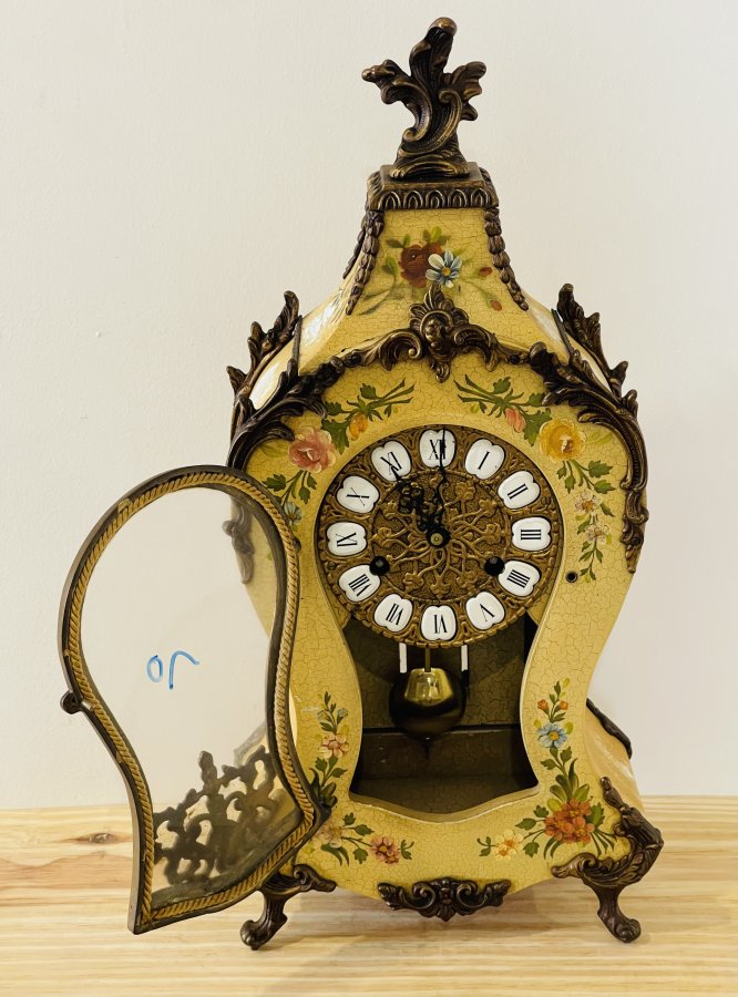 Đồng hồ Boulle cổ Italia máy Đức sơn rạn chân chim 2 chuông bính boong size 47/23cm.Hoạ tiết hoa văn đồng đúc,nền vẽ hoa men sơn nổi.Tất cả đều nguyên bản hoạt động tốt.Chìa khóa ngoài nguyên zin lắc mạ vàng lacke rất đẹp.Còn giấy Catalogue của đồng hồ.
