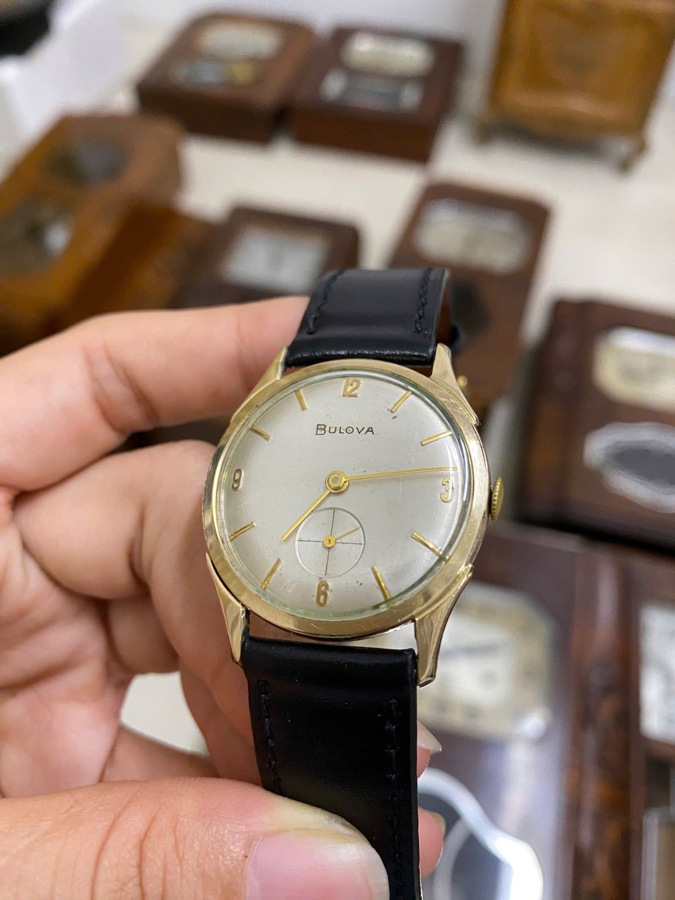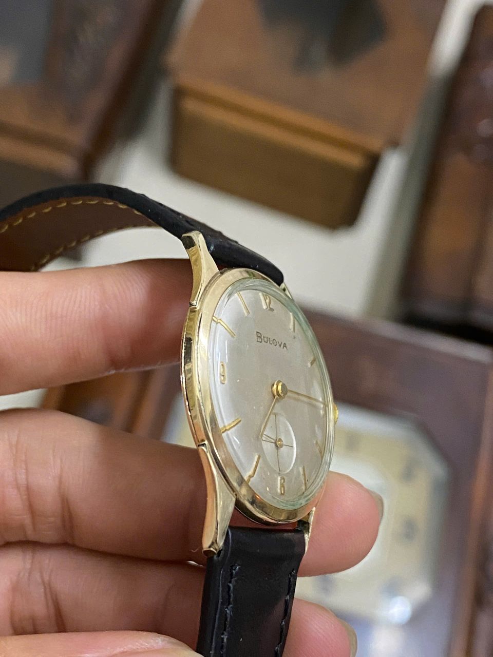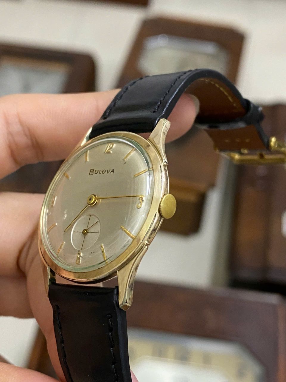 Đồng hồ cổ đeo tay Bulova bọc vàng 10K rolled Gold Plate Size: 32.1mm / Lên cót tay Kim phụ chạy giây góc 6h Nam tay nhỏ vừa đeo chiếc này được ạ! Giá: 2,5tr