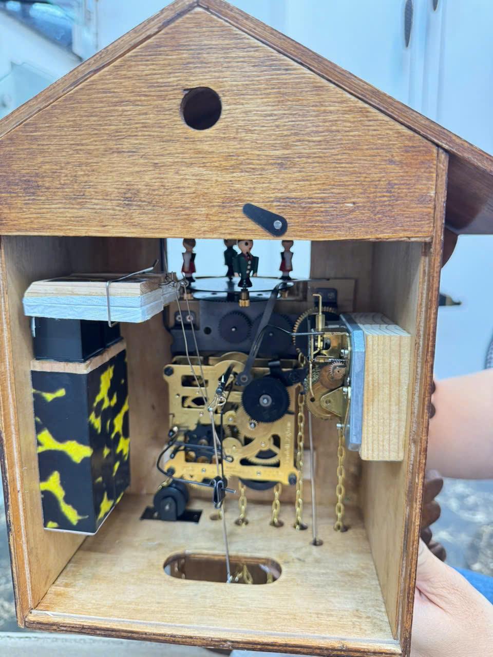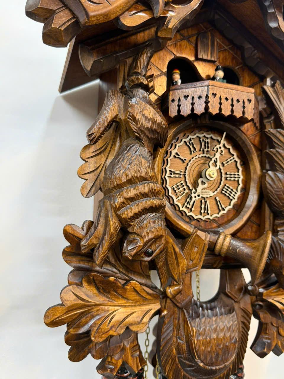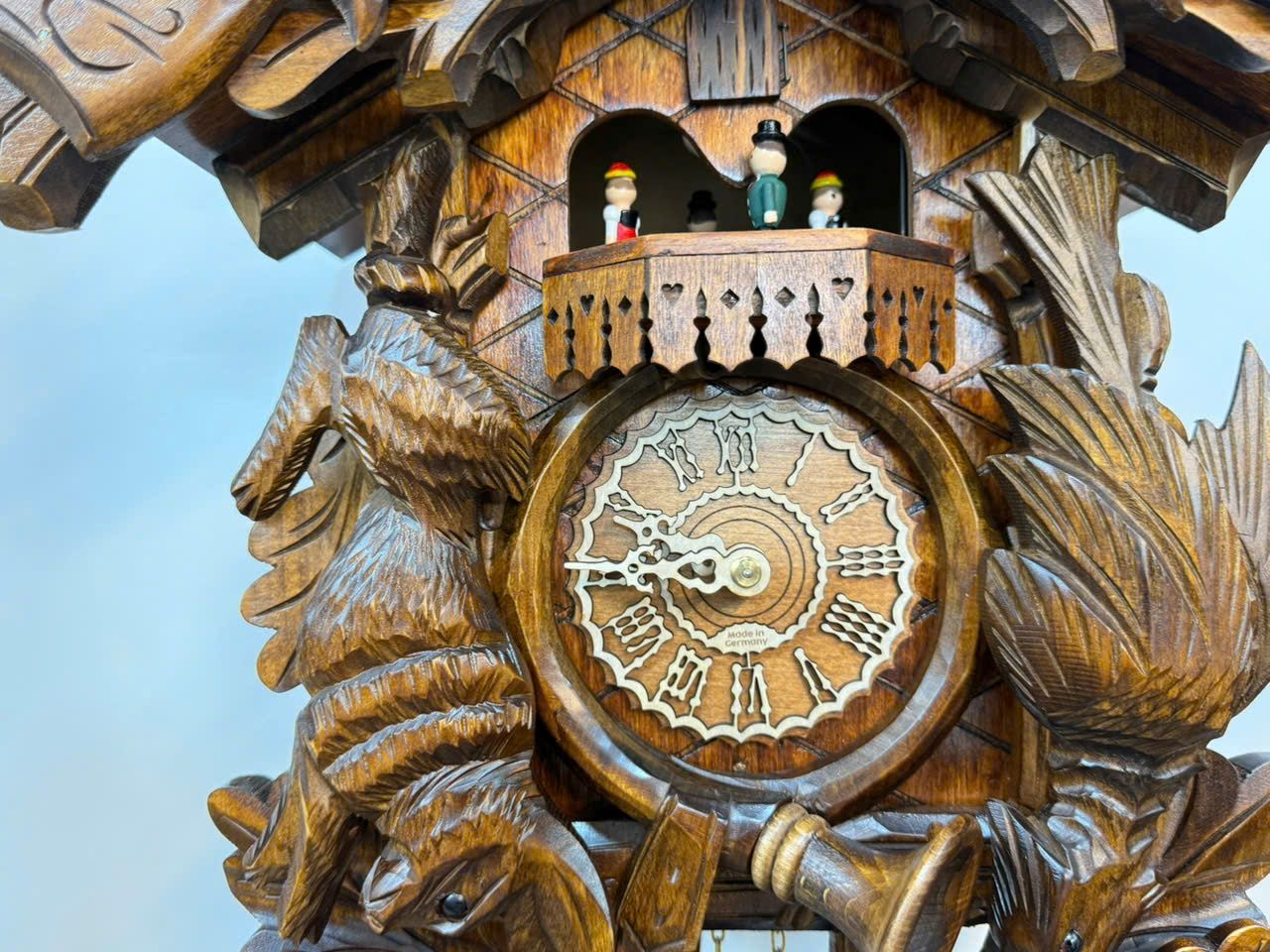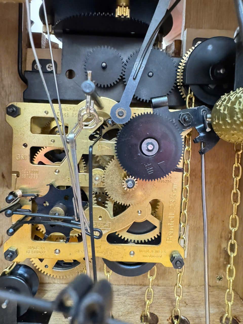 +⃝ Máy : Chính Hãng 𝐑𝐄𝐆𝐔𝐋𝐀 3 tạ xích (tạ nhạc, tạ máy, tạ chuông), hoạt động 𝐪𝐮𝐚̉ 𝐥𝐚̆́𝐜 𝐠𝐨̂̃ được điêu khắc, chạy 𝟕 𝐧𝐠𝐚̀𝐲 lên dây. Sở hữu 𝐠𝐨̂𝐧𝐠 𝐯𝐨̀𝐧𝐠 và tiếng Cúc Cu cổ điển của dòng đồng hồ Cuckoo. Đặc biệt phần 𝐡𝐨̣̂𝐩 𝐠𝐢𝐨́ để tạo tiếng Cúc Cu được sản xuất riêng tại 𝐓𝐡𝐮𝐲̣ 𝐒𝐲̃.