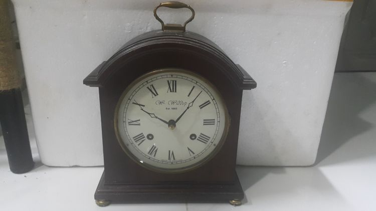 Vỏ gỗ nguyên khối rất nặng 4kg . Kích thước cao 23 cm, ngang 18cm. Máy nguyên rin, chuông chén sáng bóng chạy 8 ngày Điểm chuông tròn giờ và 30 phút