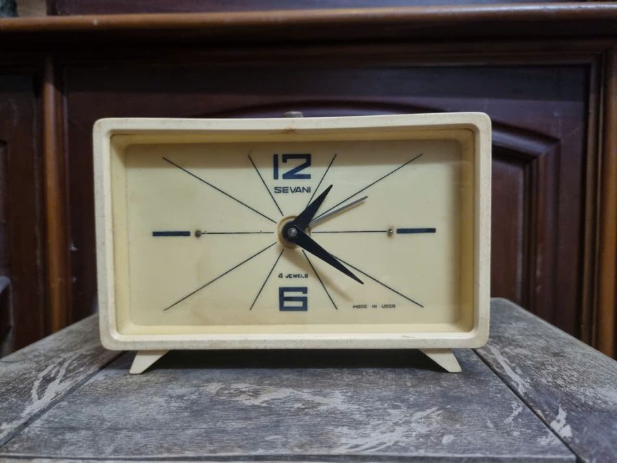 Đồng hồ để bàn báo thức Sevani Liên Xô. Hình thức còn đẹp. Chạy tốt. Đủ núm nút. Ngang 16 cm, cao 10,5 cm. ☎ Face + Zalo 0788275427