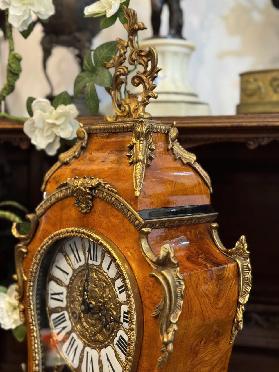 + Vỏ đồng hồ được ốp nu hoa văn sang trọng, toàn thân khảm các chi tiết đồng cầu kỳ, tinh tế.