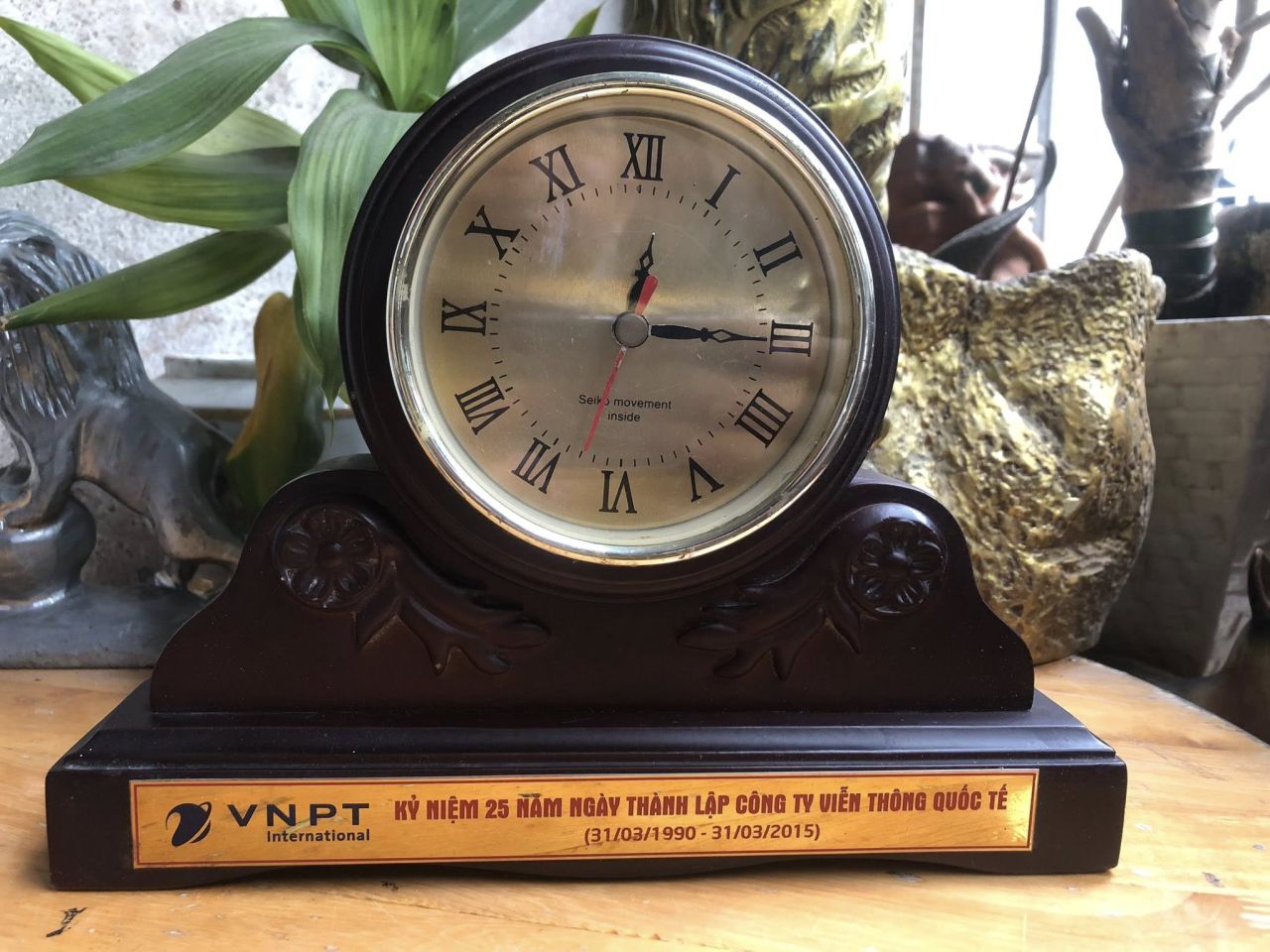 Đồng hồ để bàn Công ty viễn thông quốc tế*** nhân kỷ niệm 25 năm thành lập***, chất liệu gỗ tự nhiên hoa văn nổi, đồng hồ Seiko, chạy chính xác, kt 19x24x5 cm. Giá bán: 300k + ship, nhận ship toàn quốc.