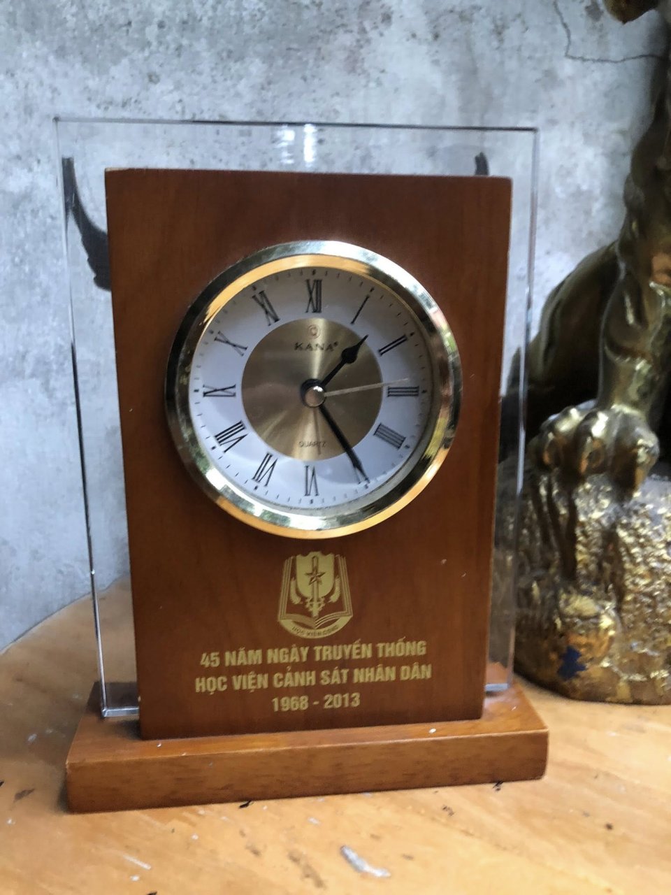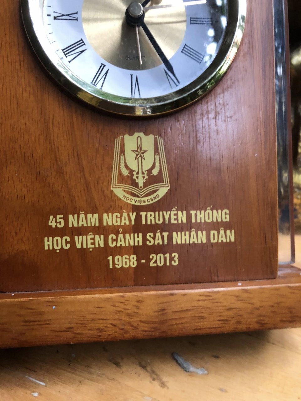 ĐỒNG HỒ ĐỂ BÀN – KỶ NIỆM 45 NĂM HỌC VIỆN CẢNH SÁT NHÂN DÂN (1968–2013) Chất liệu: Gỗ tự