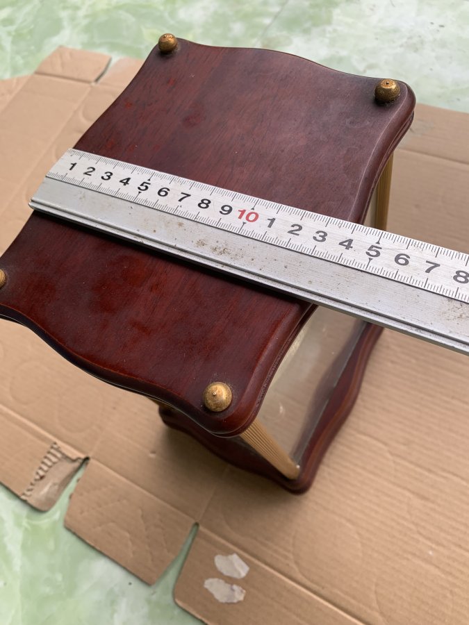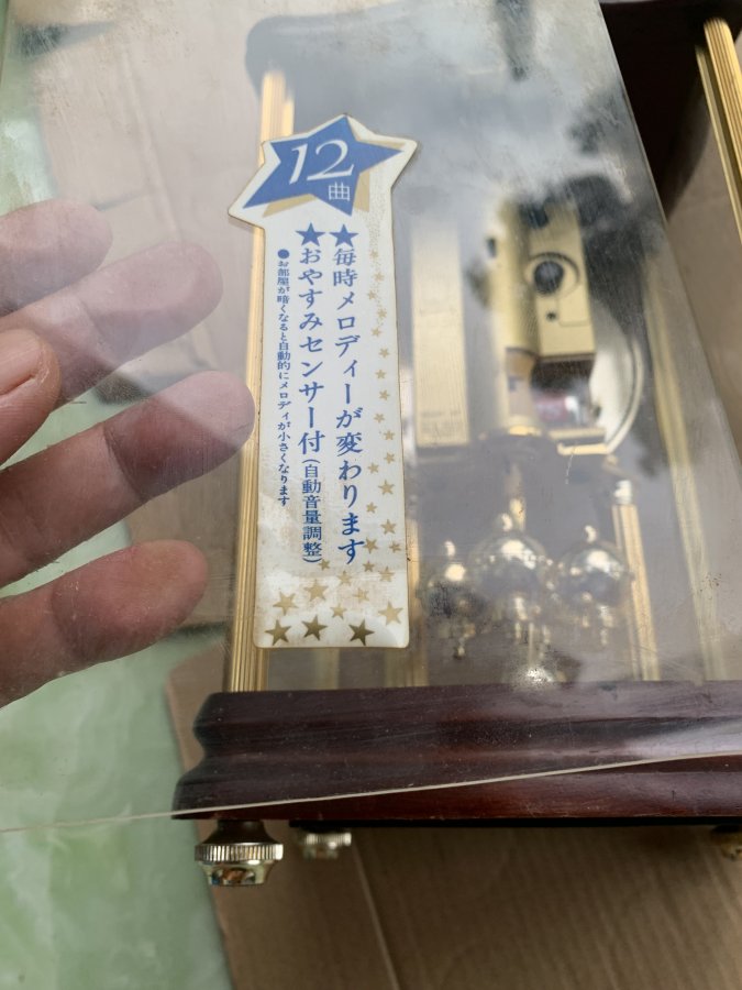 Sản phẩm sản xuất tại Nhật, chưa vệ sinh, còn lành nguyên hoạt động tốt, đáy và nắp bằng gỗ, 3 bên bằng kính, nắp lưng bằng mica. Đồng hồ có nhạc chuông đơn âm với 12 bản nhạc thay đổi theo mỗi giờ có thể điều chỉnh volume, tự động nhỏ tiếng khi ánh sáng yếu nhờ cảm biến quang học trước mặt đồng hồ. Nó sử dụng 1 pin trung. Sản phẩm không kèm pin. Cám ơn đã xem tin.
