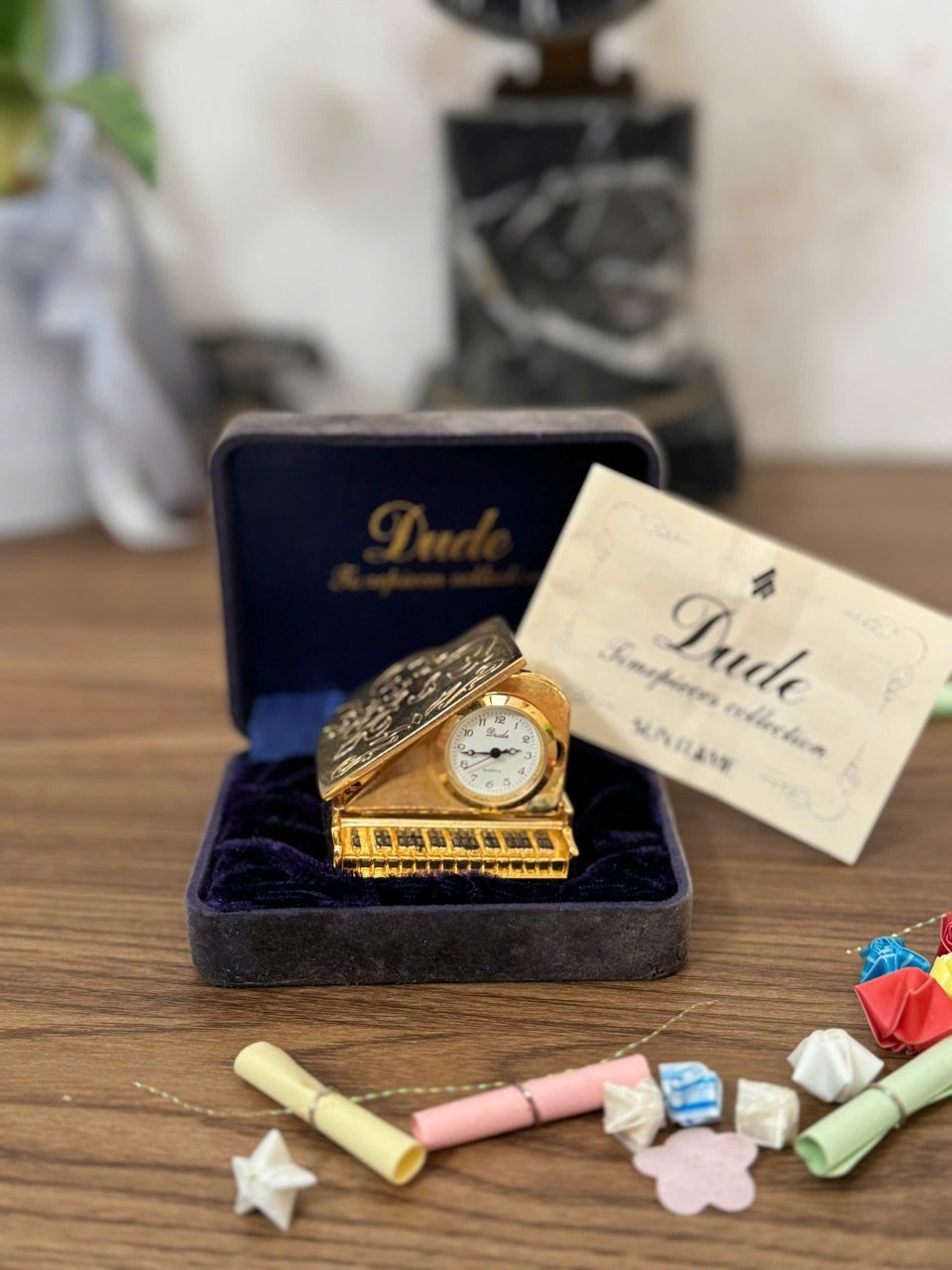 Dáng chiếc đàn nhỏ xinh kết hợp màu vàng ươm tuyệt đẹp. Máy chạy pin bền bỉ, chuẩn xác. Làm quà hoặc trưng bày rất đẹp và độc lạ