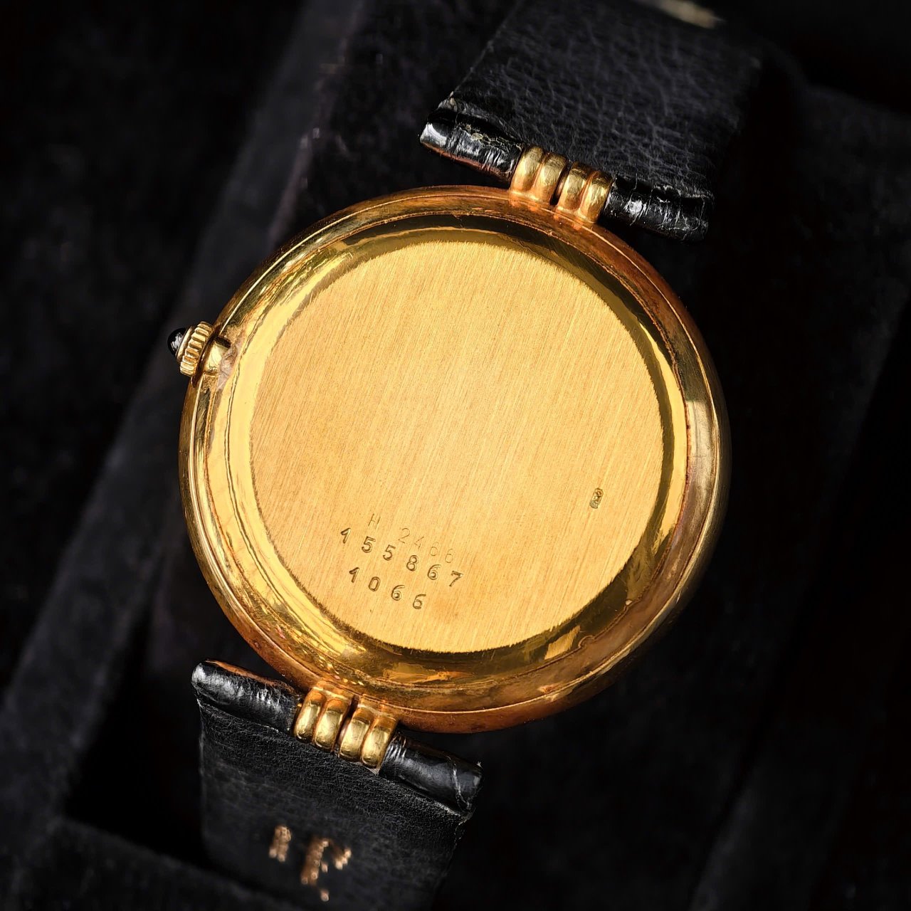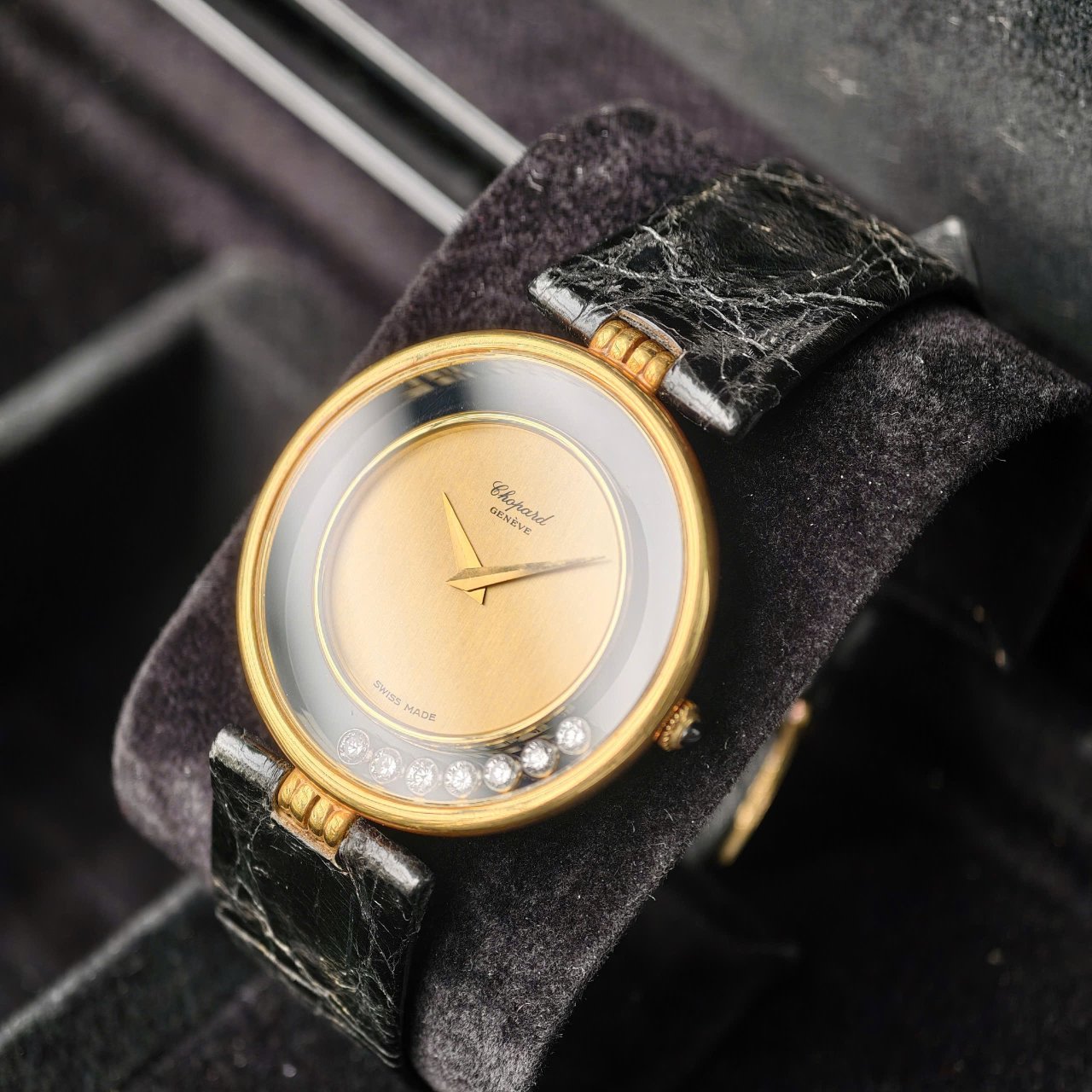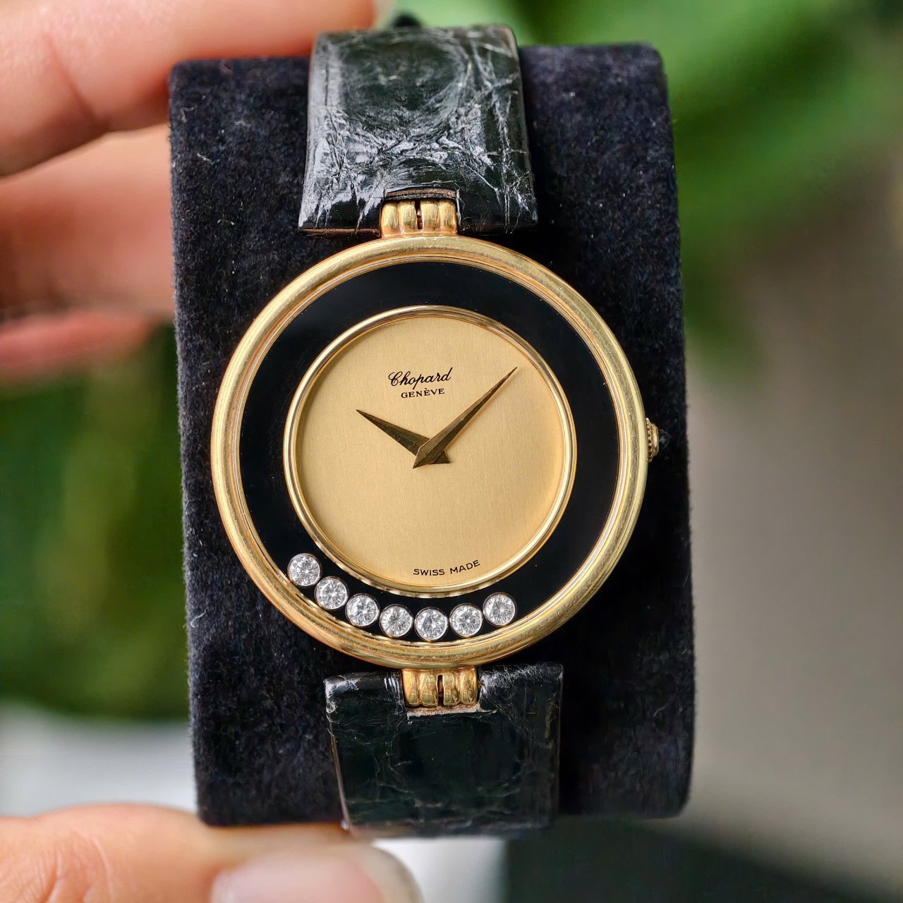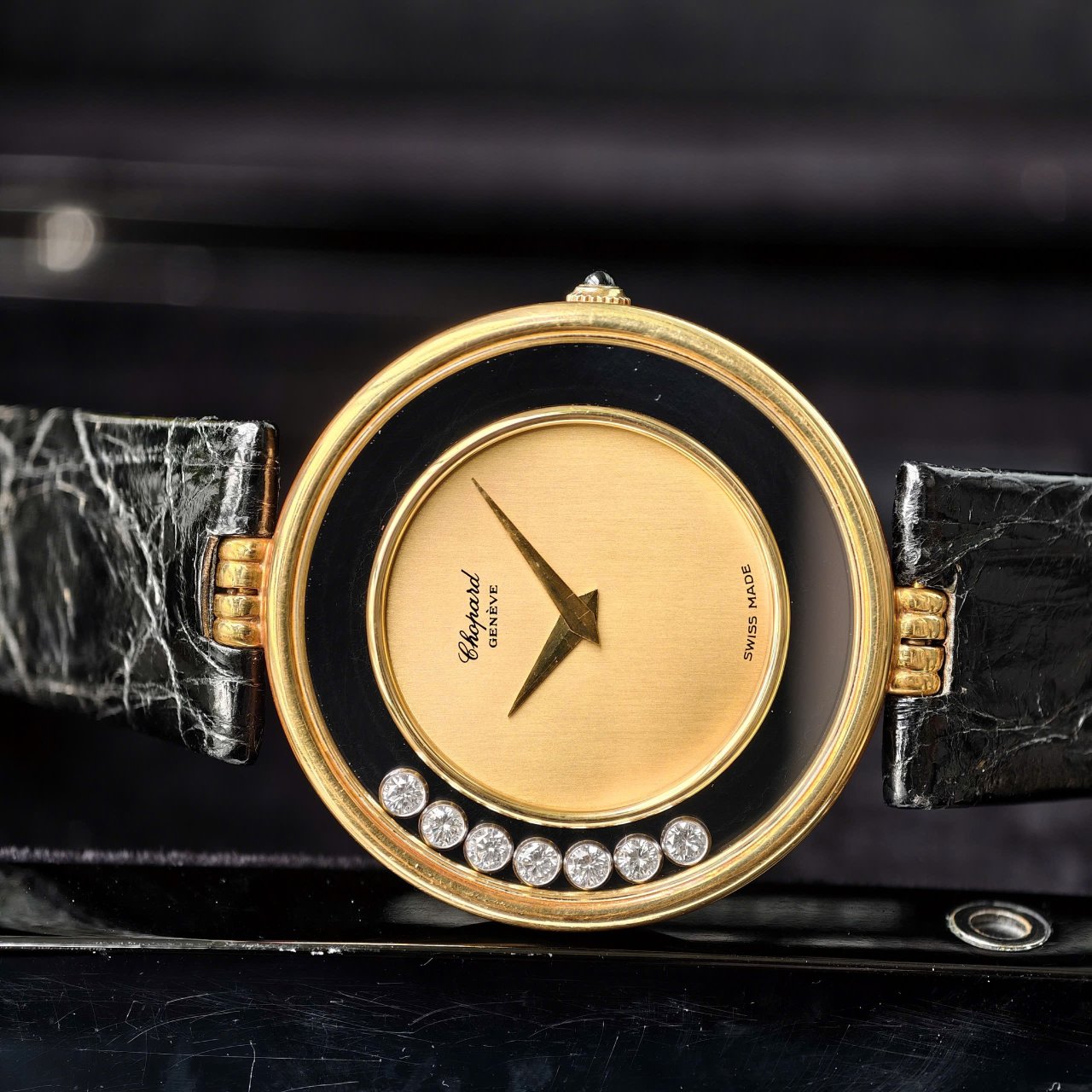Đồng hồ đeo tay Chopard "Happy Diamond" bằng vàng 18ct dành cho phụ nữ hiện đại, mặt số mạ vàng nằm trong vành đen với bảy viên kim cương cắt sáng, chứa trong vỏ trơn đường kính 33mm