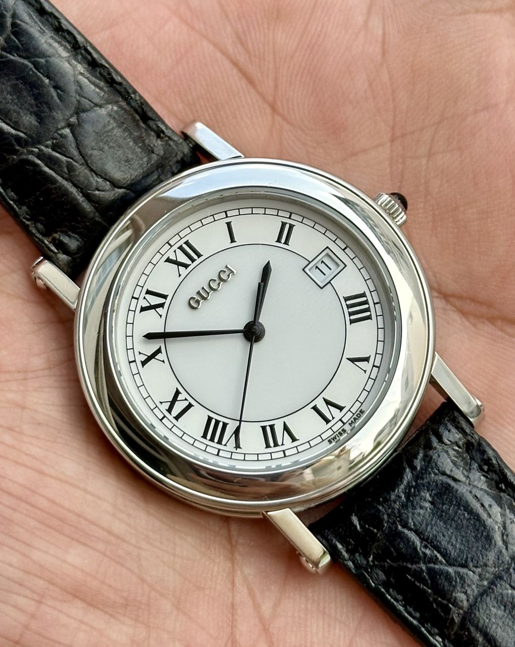 Giao lưu chiếc đồng hồ Gucci 7400M chính hãng, sử dụng máy quartz Gucci Thuỵ Sỹ nguyên zin chạy chuẩn, chất liệu Stainess Steel Plated vàng trắng toàn thân, kính Saphire chống xước. Nguyên zin toàn diện cả dây khoá, độ mới cao . Size 34mm cả nam nữ mang đều đẹp. Giao lưu chỉ ĐÃ BÁN