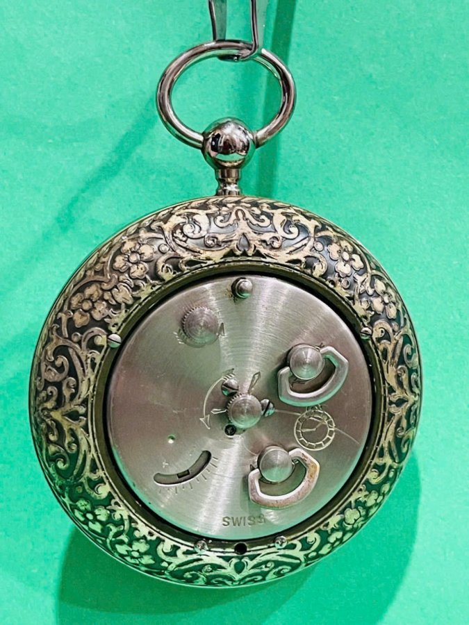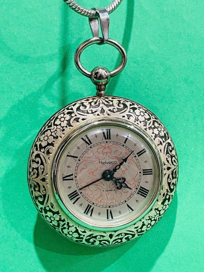 Đồng hồ HELVECO Thuỵ Sỹ vỏ đồng mạ bạc chạm khắc hoa dây nổi 8cm.Chế tác tinh xảo mang dáng dấp của đồng hồ quả quýt Quí Tộc tK18.Dây đeo inox không rỉ sét còn rất bóng đẹp.Mays cơ cót ngày có chế độ báo thức.Xứng đáng sưu tầm vì phiên bản này hiếm gặp khó tìm được chiếc thứ hai.