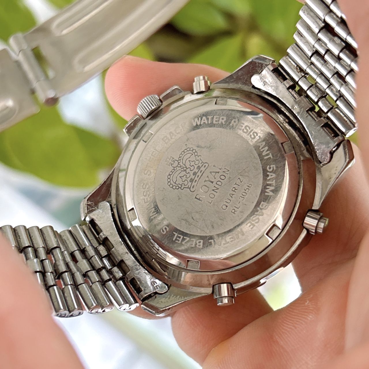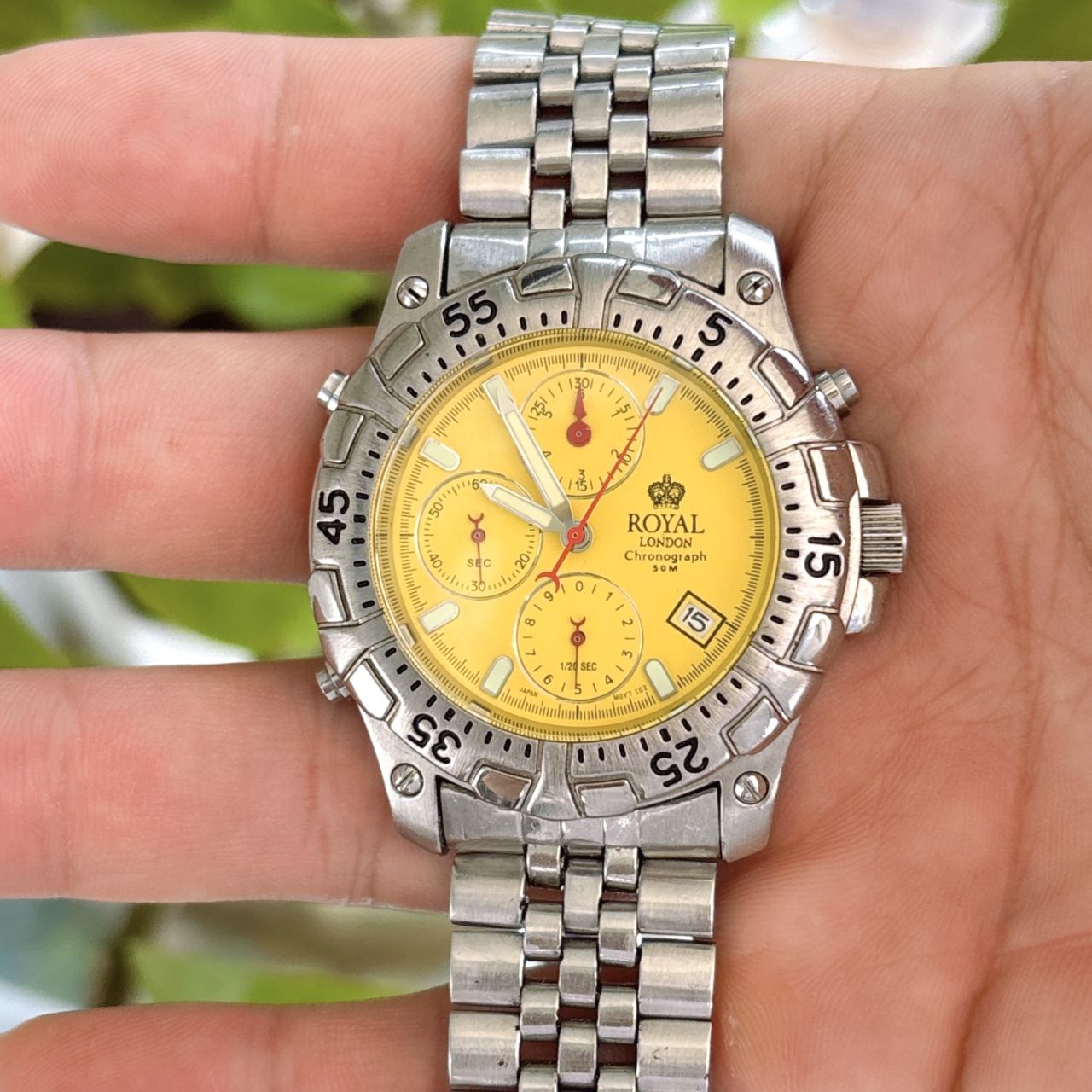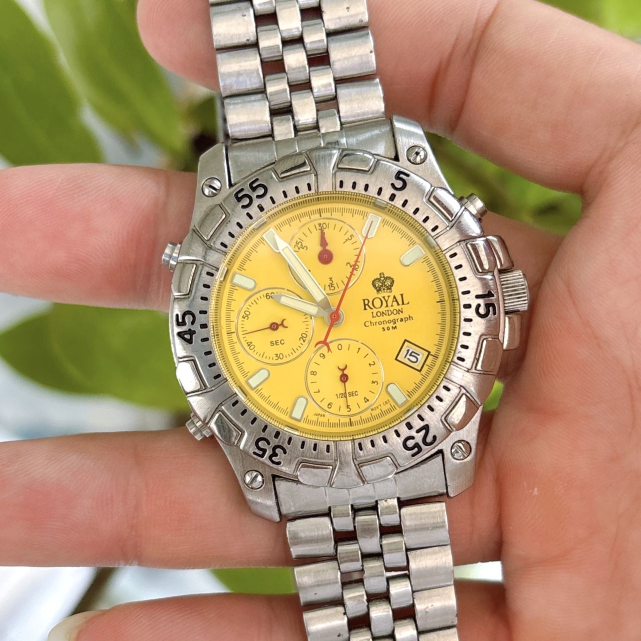 Đồng hồ chính hãng hiệu ROYAL LONDON Chronograph mặt số Vàng zin của hãng rất đẹp & ít gặp. Niềng xoay được. Các chức năng xem giờ phút giây, ngày & núm bấm giờ chronograph đang hoạt động tốt.
