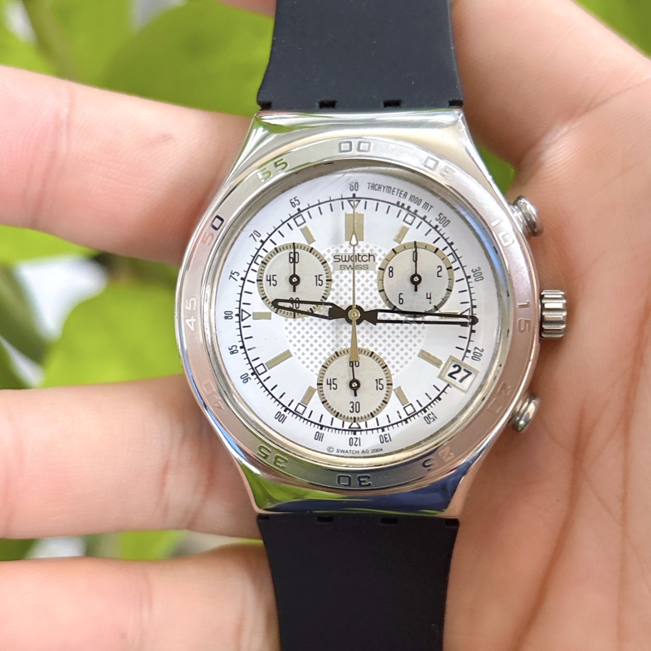 Đồng hồ hiệu Swatch Irony 6 Kim Chronograph chính hãng Thuỵ Sỹ sản xuất nguyên zin, khoá zin Swatch. Toàn thân All Stainless Steel.