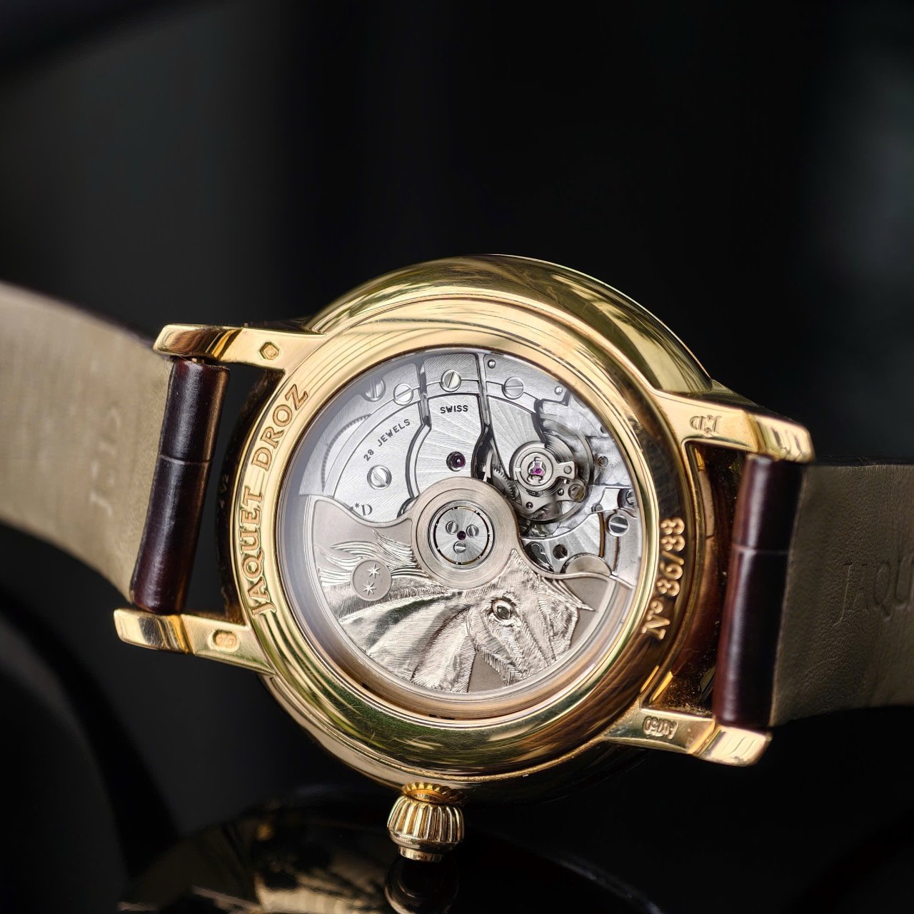 Chiếc đồng hồ sử dụng bộ máy tự động quả văng vàng trắng 18k được khắc tay thủ công hoạ tiết hình đầu ngựa , đồng hồ có thể vận hành trong thời gian dài, có độ bền và giá trị sưu tầm cao. Chất liệu vỏ được làm từ Vàng khối 18k , chất liệu quý sang trọng nhất trong giới đồng hồ. Đồng hồ vàng khối luôn là khao khát của người chơi đồng hồ. Đồng hồ được trang bị dây da làm từ chất liệu cao cấp, hoàn thiện tốt, ôm gọn vào tay người đeo. Chất liệu kính làm từ Sapphire đem lại khả năng chống xước, chống lóa tuyệt vời.