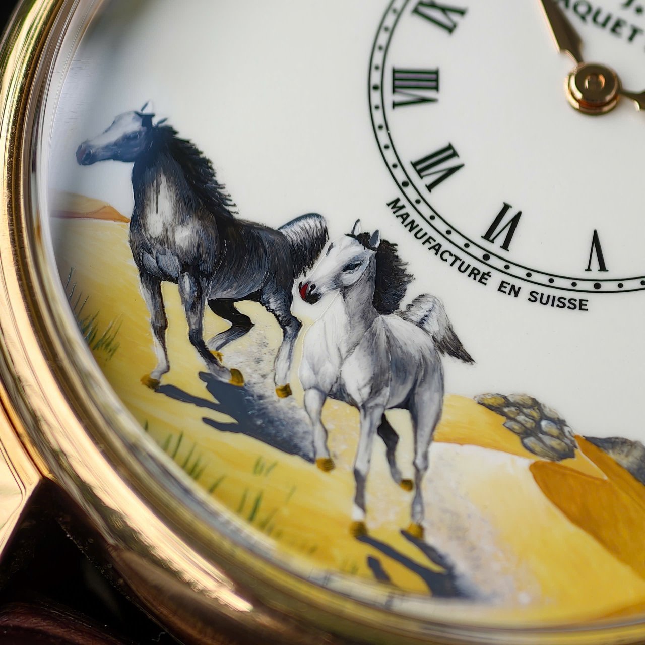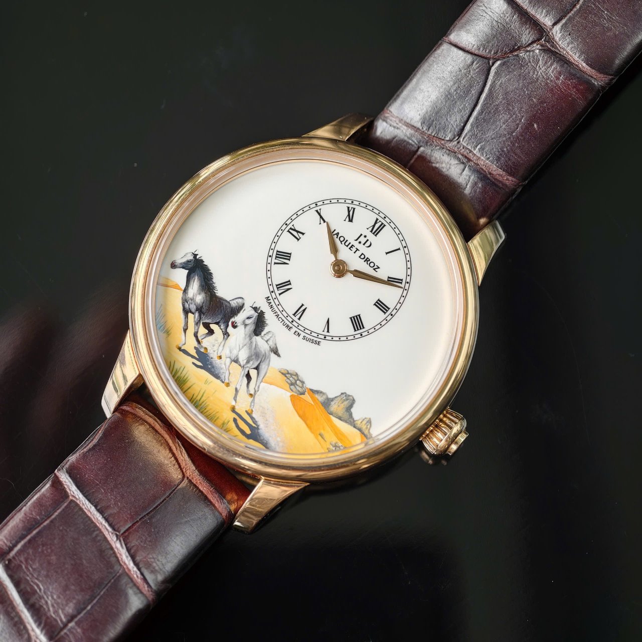 Điểm nhấn của chiếc đồng hồ là hình ảnh 2 con ngựa chạy trên đồng cỏ được nghệ nhân vẽ tay lên mặt số.
