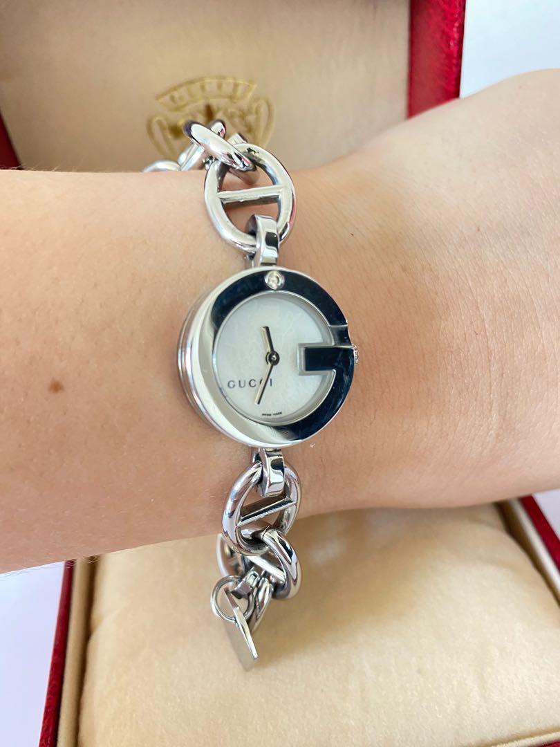 Đồng Hồ Gucci Nữ ( Kiểu Lắc Tay ) Mặt Vân Hoa, Niềng có đính 1 Viên Kim Cương Lớn ~ 2 ly.