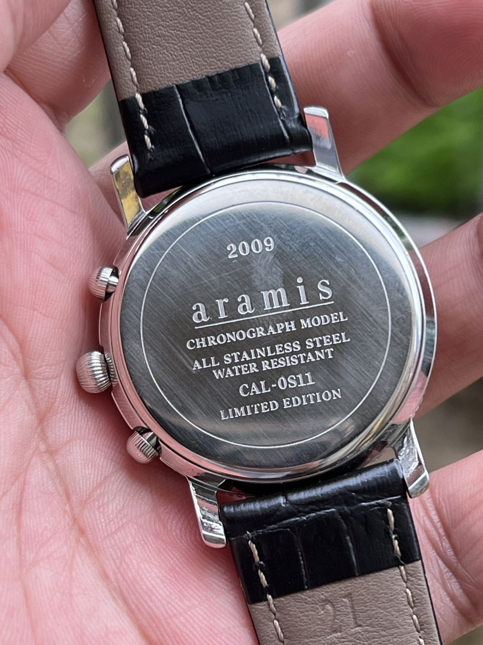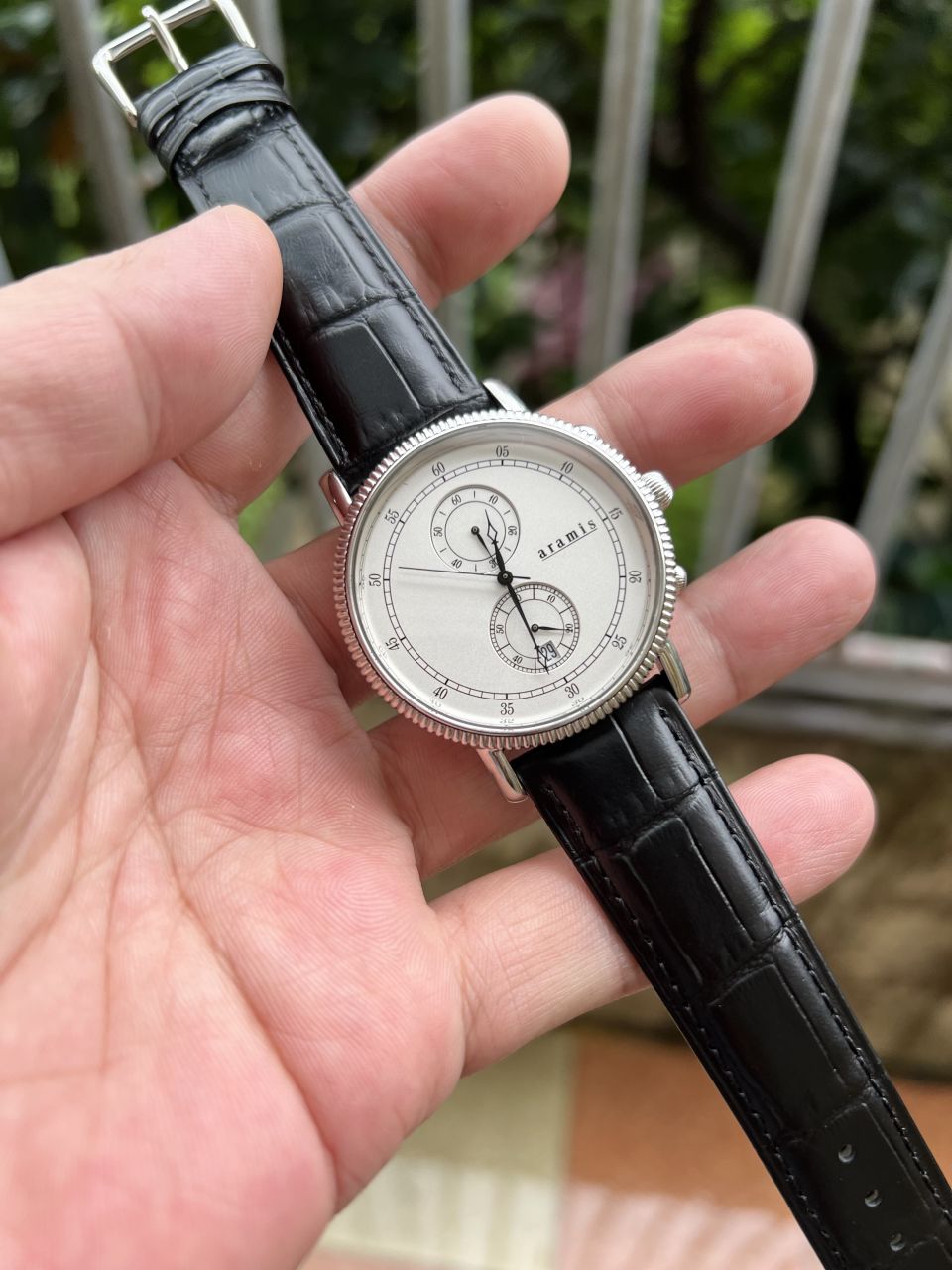 . Aramis cổ điển, lịch lãm cho nam . Size: 40mm không tính núm . Vỏ thép cực đẹp, vành băm kiểu cổ điển . Mặt, kim cọc rất đẹp . Máy quarzt zin Chronograph Nhật đang chạy chuẩn . Kính Saphia chống trầy . Dây khoá thay mới . Mời các bác.