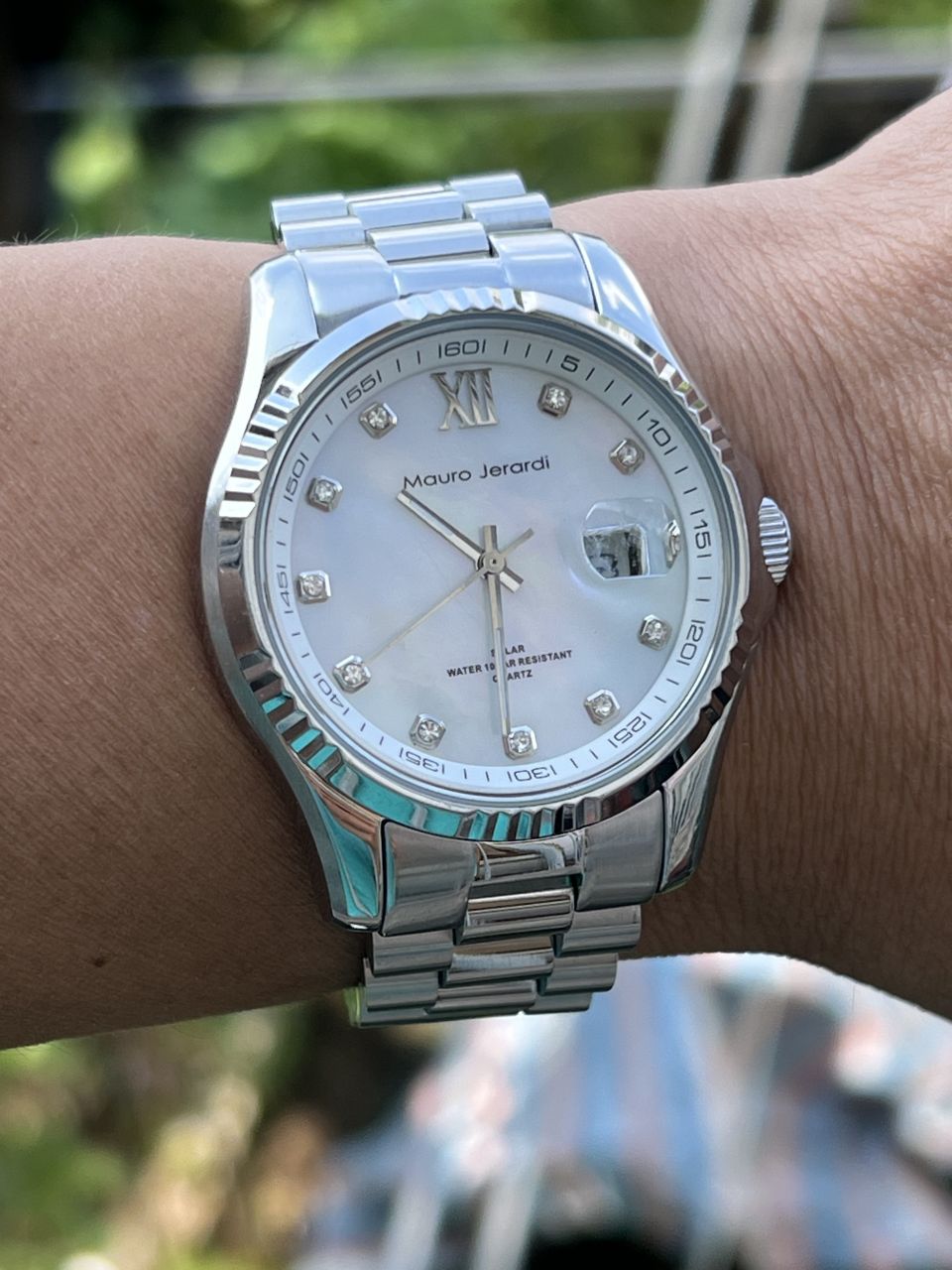 . Đồng hồ nam MAURO JERARDI cực đẹp . Size: 40,5mm không tính núm . Dây vỏ thép rất đẹp, đầm tay . Mặt khảm trai, cọc hạt cực đẹp . Máy quarzt Nhật đang chạy chuẩn . Đồng hồ hiện chống nước rất tốt