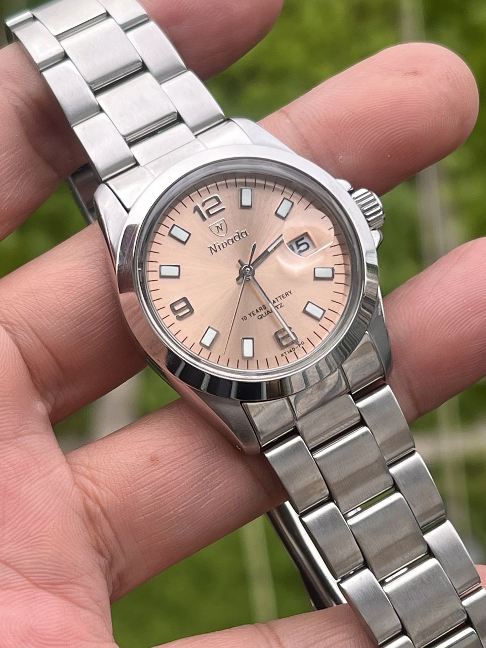 . NIVADA phom rolex , mặt cá hồi tuyệt đẹp . Size: 36mm . Dây vỏ thép . Mặt màu rất độc đáo . Kim, cọc đẹp . Máy quarzt Nhật zin, dòng máy cho thòi gian sử dụng pin dài ( khoảng 5 năm mói phải thay pin mới) . Liên hệ em ngay nếu yêu thích nhé.