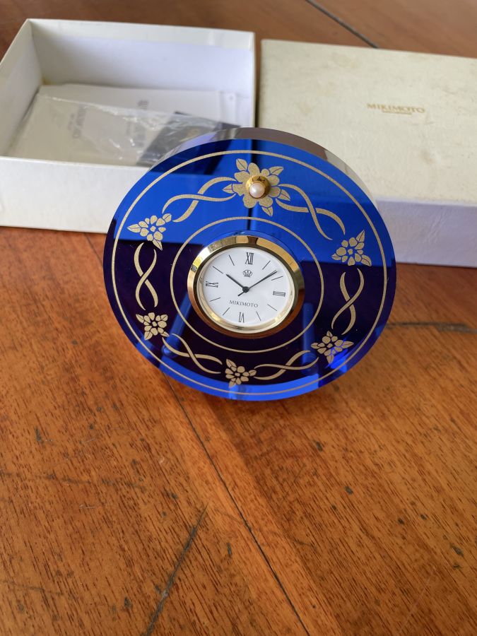 Bán 1 đồng hồ để bàn pha lê xanh Mikimoto Japan chưa sử dụng. Đồng hồ làm bằng khối pha lê xanh có đính viên ngọc trai rất đẹp