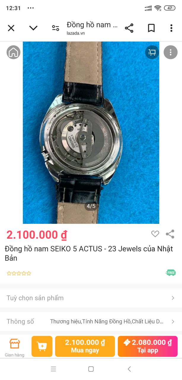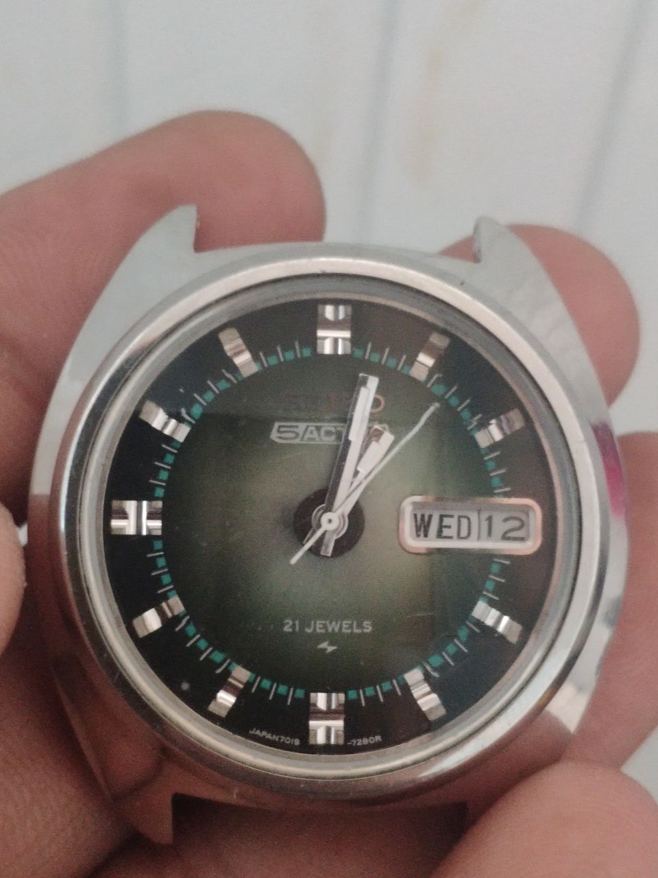 Seiko 5 actus. automatic thập niên 70. 2 lịch. lịch nhấn và xoay cả 2 hoạt động hoàn hảo OK hết. bộ máy 21 jiwels. mặt zin xanh lá đậm kết hợp cọc số nổi rất đẹp. size to ngang 37mm. dài 40,5mm luôn càng.