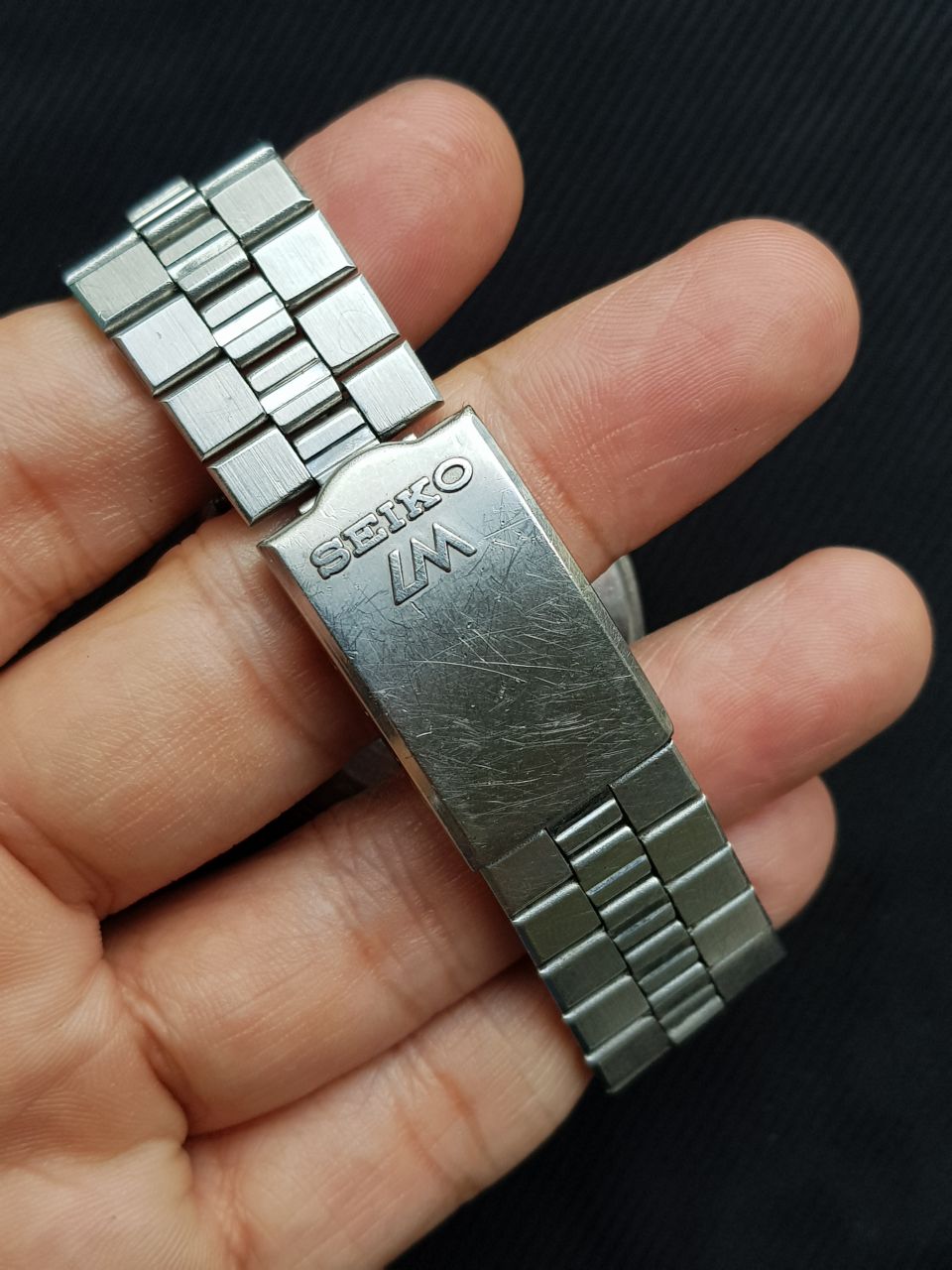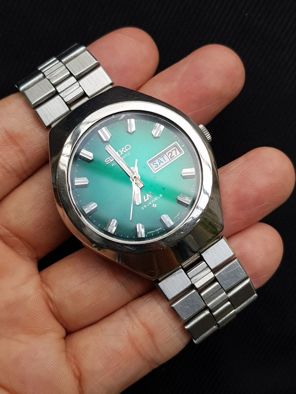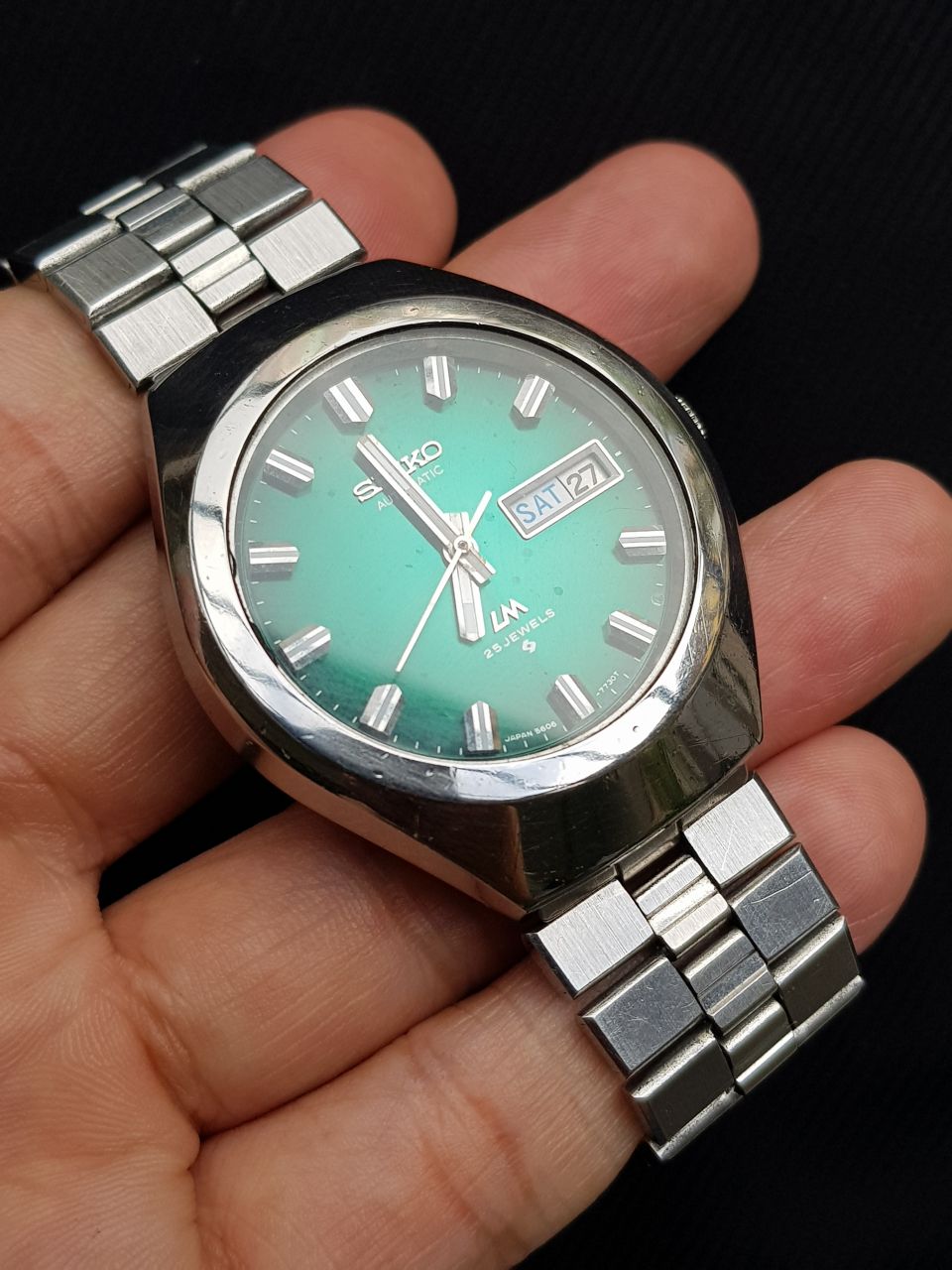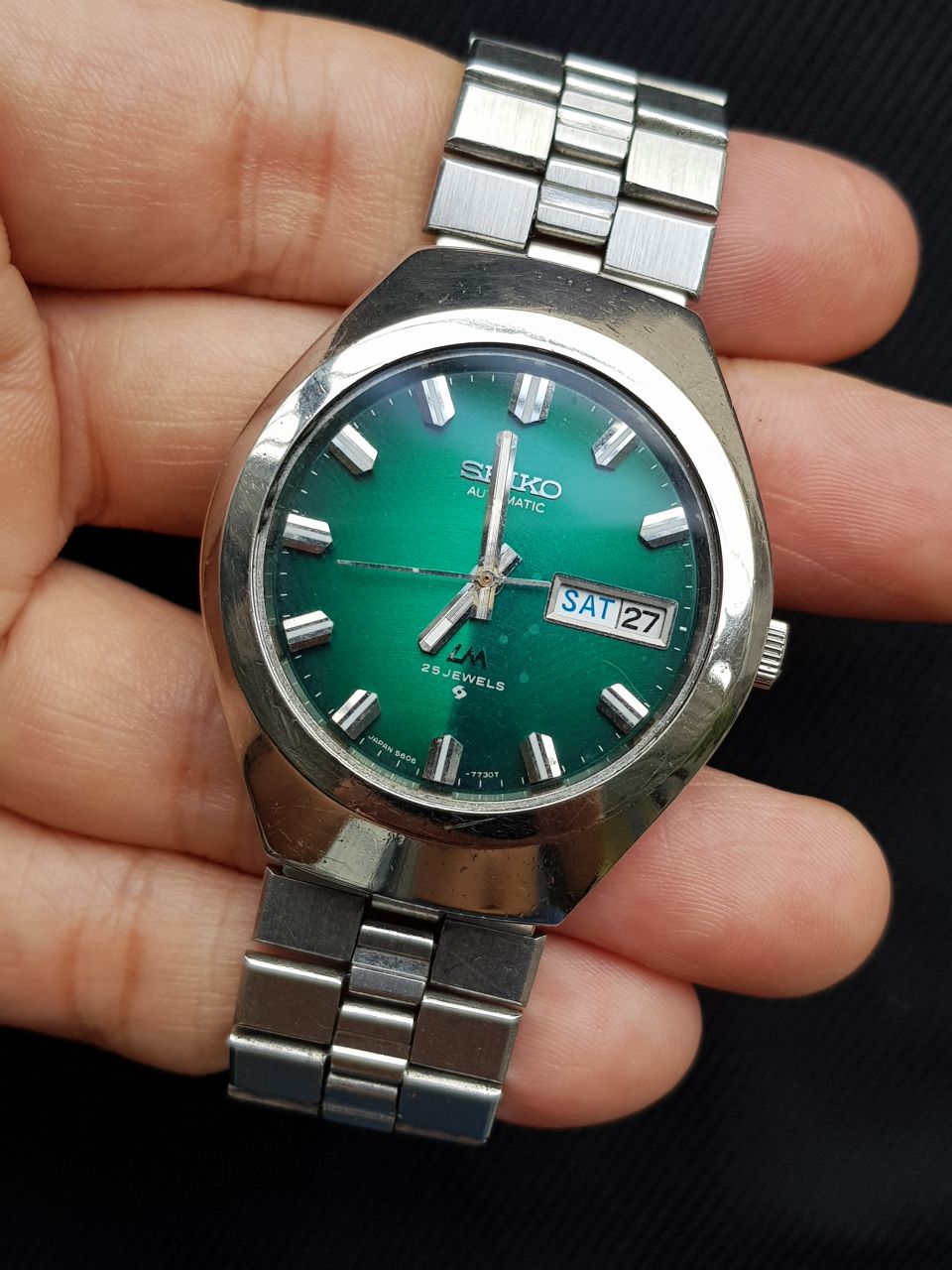 SEIKO LM automatic vintage sx năm 1977. Máy automatic 5606 25 chân kính có hỗ trợ cót tay, hacking stop. Dial xanh lá cây nguyên bản đẹp. Cọc số thép nổi. Dây thép zin đi kèm.