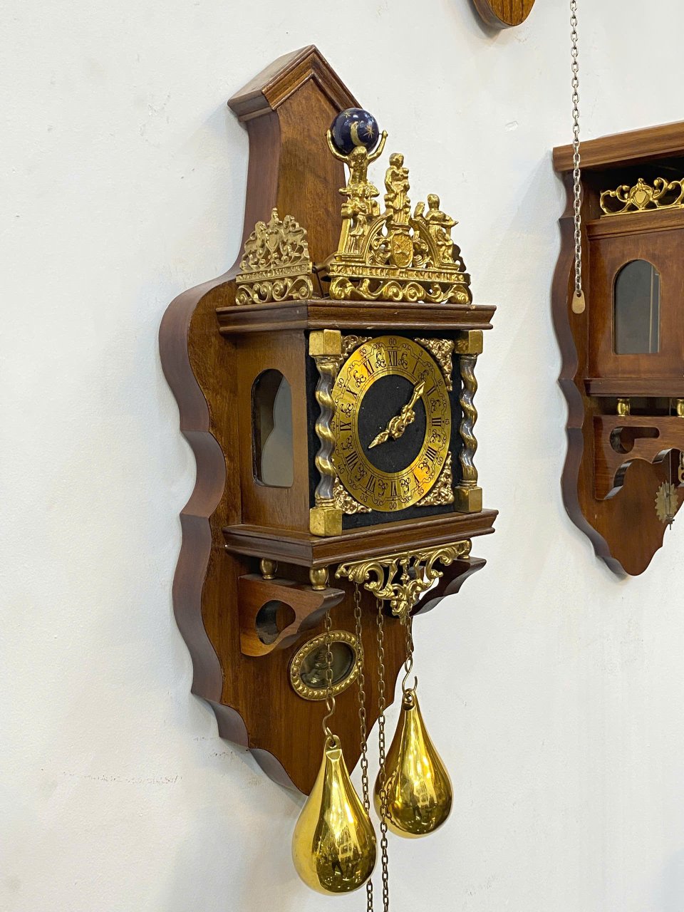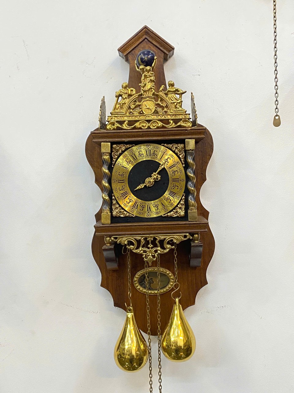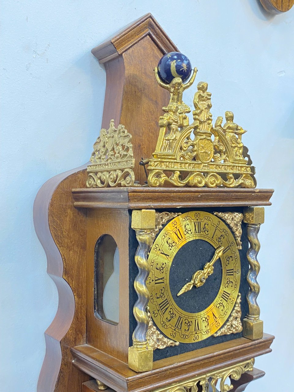 🤩 Ngoại thất : gỗ phối các phù, điêu đồng đúc : vị thần Atlanta , hai chú sư tử và các thiên thần rất đẹp , hai bên mặt số là 2 cột xoắn bằng đồng tạo nên sự vững chắc cũng như điểm nhấn sang trọng cho chiếc đồng hồ