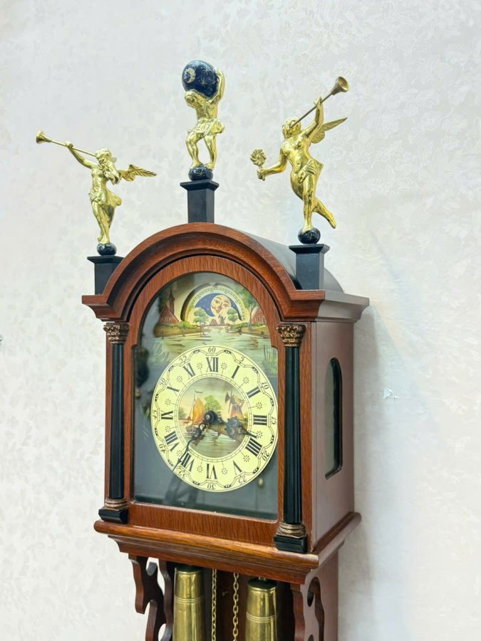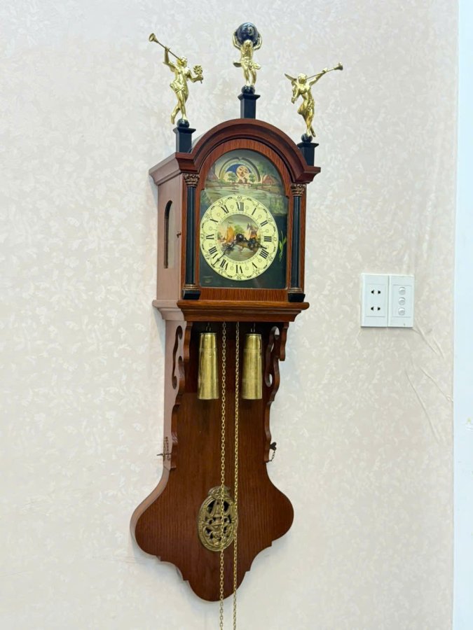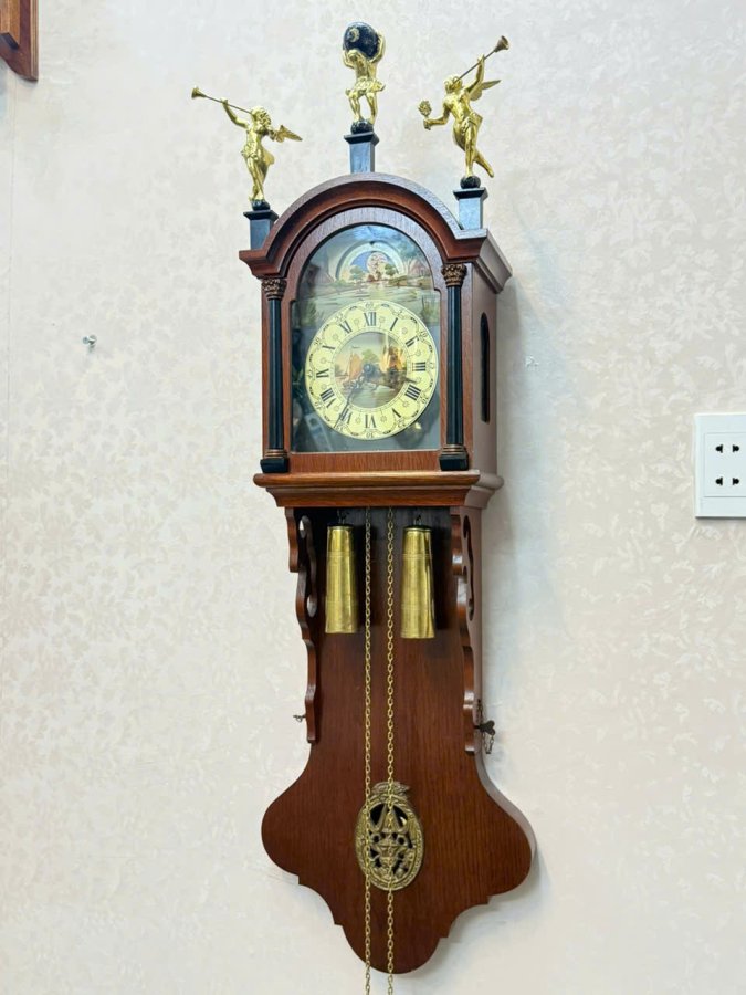 ✨Ngoại hình : vỏ gỗ phối phù điêu đồng ,3 thiên thần bằng đồng cổ điển nguyên bản - Mặt số vẽ tay cổ điển, chữ số la mã , lịch trăng sao sáng đẹp - Máy móc đã được lau dầu , cân chỉnh chạy tốt