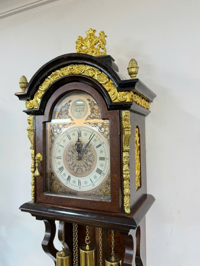 - Ngoại thất : toàn thân bằng gỗ nu phối các chi tiết đúc chạm mạ vàng sang trọng + Mặt số la mã trên nền hoa văn cổ điển rất đẹp + Bộ tạ lắc bằng đồng sáng bóng