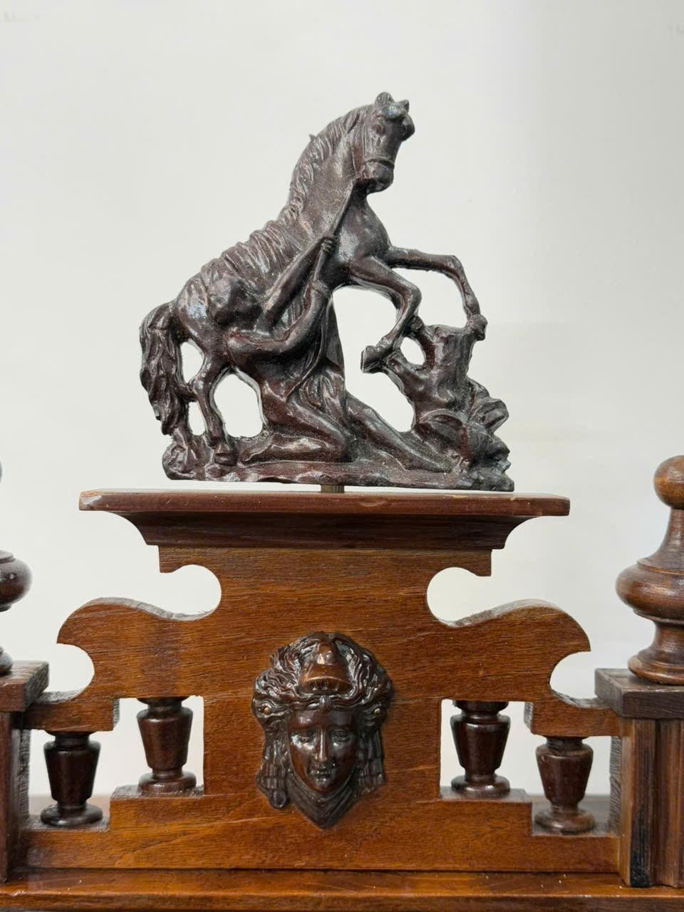 +⃝ Chiếc đồng hồ được thiết kế kiểu dáng song tiện mão hình con ngựa . Các chi tiết gỗ được chạm khắc thủ công rất tinh xảo. Phần đầu với điểm nhấn là chú ngựa đang cố phi về phía trước , hai cột nằm đối xứng 2 bên tạo sự vững chắc. Phần đuôi được tạo hình rất sang trọng, như 1 bệ đỡ cứng cáp và còn mang lại sự hài hoà, tao nhã cho chiếc đồng hồ.