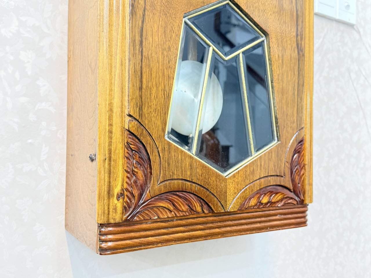• Kiểu dáng thùng dài cổ điển, vỏ gỗ đục chạm, kính ghép mài cạnh , lành tít
