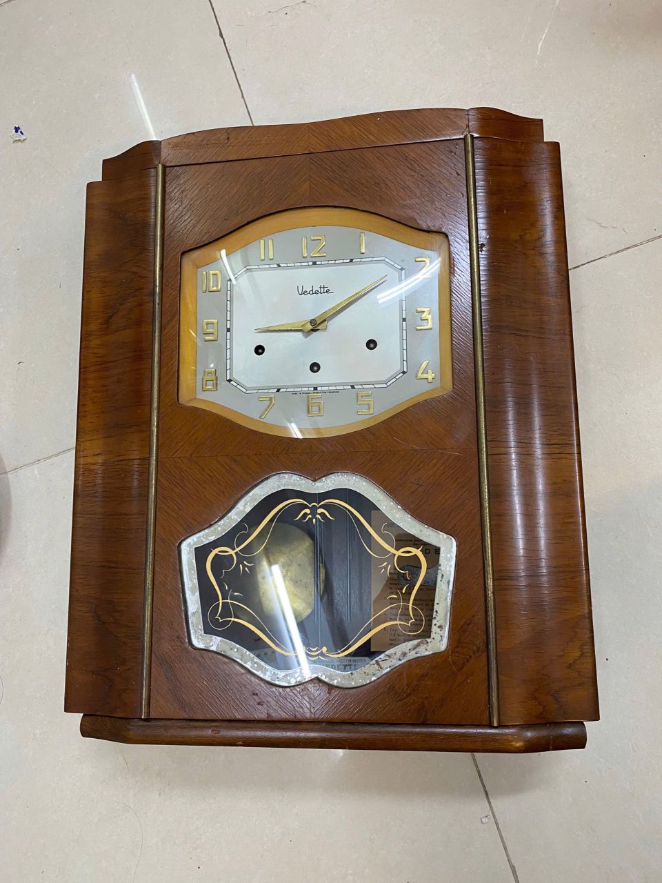 Đồng hồ treo tường Vedette 8g8b Pháp _số nổi vàng đồng (Giấy hãng)Thùng bè, mặt quay chảoGiá thợ: 8,5tr