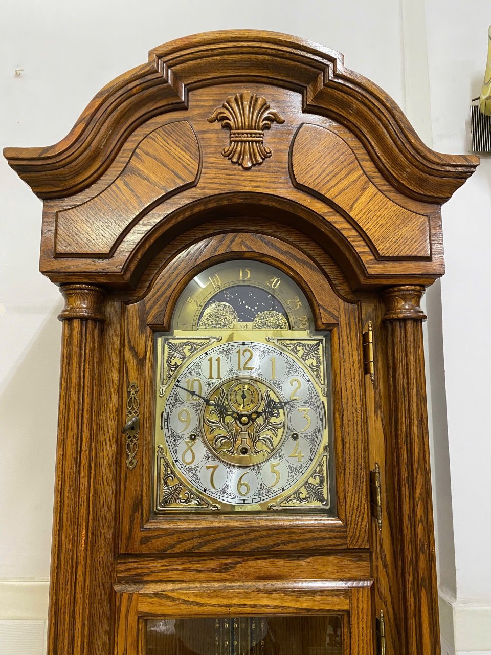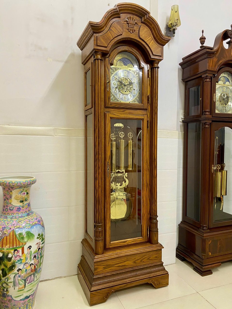 Đồng hồ tủ cây Sligh Mỹ 0878-1-CO _Ngắt chuông đêm tự động 12 gông 12 búa, chơi 3 bản nhạc KT: C 217cm, N 65.5cm Thân gỗ sồi vân tự nhiên. Thiết kế 2 cửa. Mặt chạm, lắc chạm. 3 tạ cước tuần. Lịch trăng sao bố trí góc thượng 12h. Giá thợ: 36.500