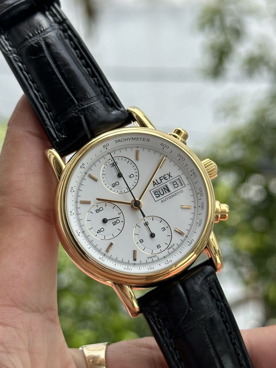 Chiếc đồng hồ tự động Thuỵ Sỹ Alfex Chronograph chính hãng. Sử dụng máy tự động Thuỵ Sỹ cao cấp 7750 siêu bền dao động 28.800 mạ vàng, thân vỏ Placque vàng dày nguyên zin rất đẹp. Mặt số nguyên zin đẹp keng. Dây da Handmade xịn mới đẹp. Size 38mm, đang hoạt động cực tốt . E giao lưu chỉ ĐÃ BÁN