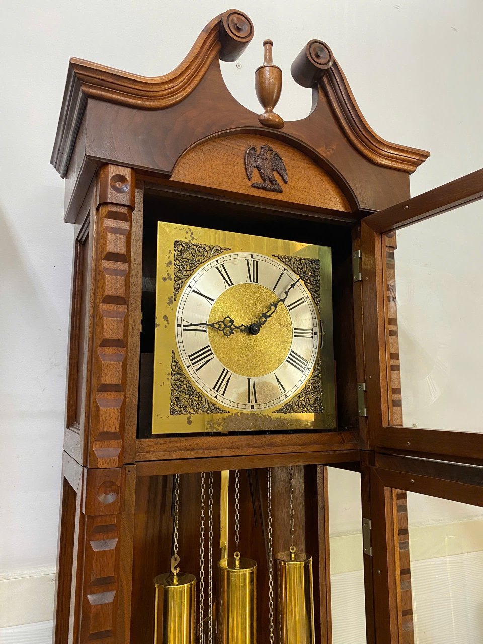 Đồng hồ tủ Đức 12 gông 12 búa 3 bài âm hay -máy UrgosC 211cm, N 57.5cmLắc đàn lớn, 3 tạ xích(bao làm sáng nền đồng mặt số)18,5tr