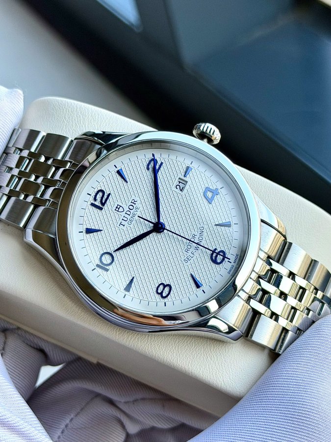 Mặt guiloche trắng tinh tế, kim cọc nung xanh đẹp tinh tế