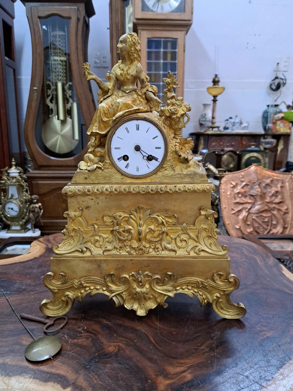 Đồng hồ tượng để bàn toàn thân Lắc Kê Vàng _máy Japy Pháp cổKT: C 44cm, N 32cm30 phút điểm giờ chuông chénMặt men. Dòng chạy chỉ tơ.