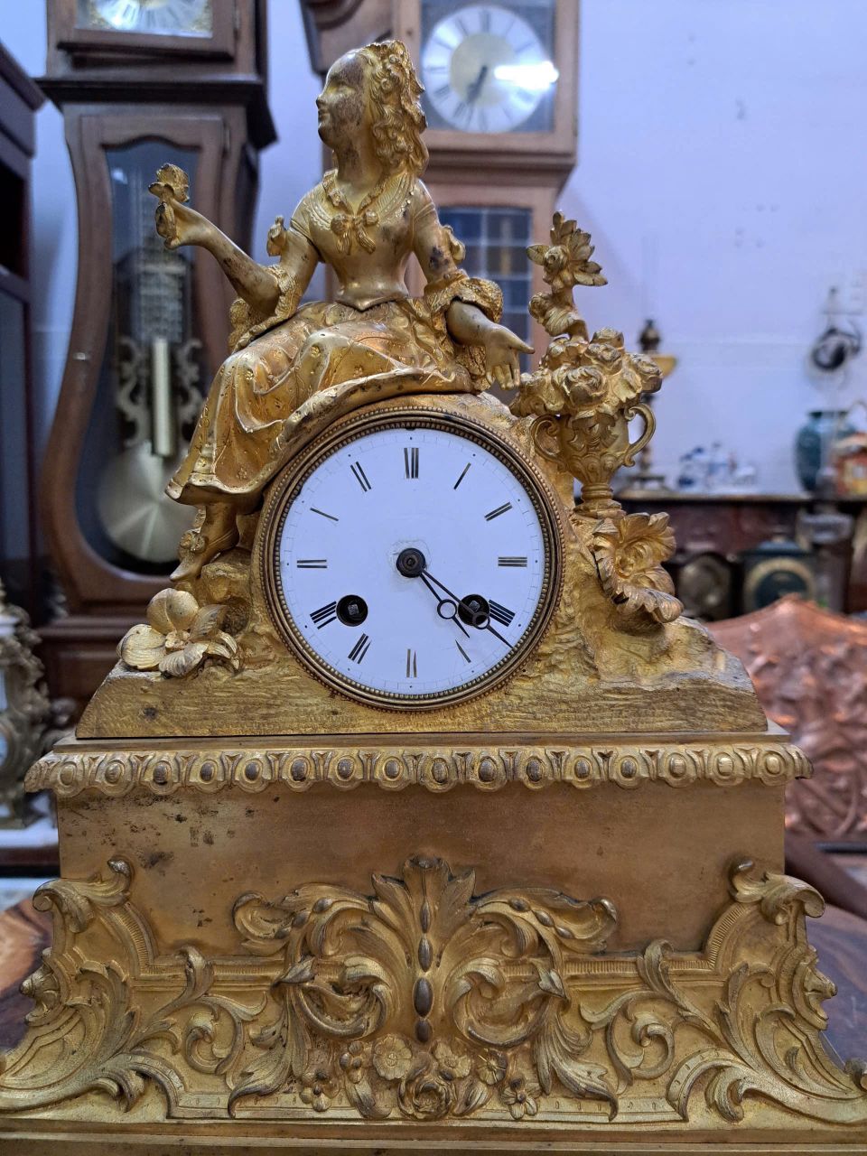 Đồng hồ tượng để bàn toàn thân Lắc Kê Vàng _máy Japy Pháp cổKT: C 44cm, N 32cm30 phút điểm giờ chuông chénMặt men. Dòng chạy chỉ tơ.