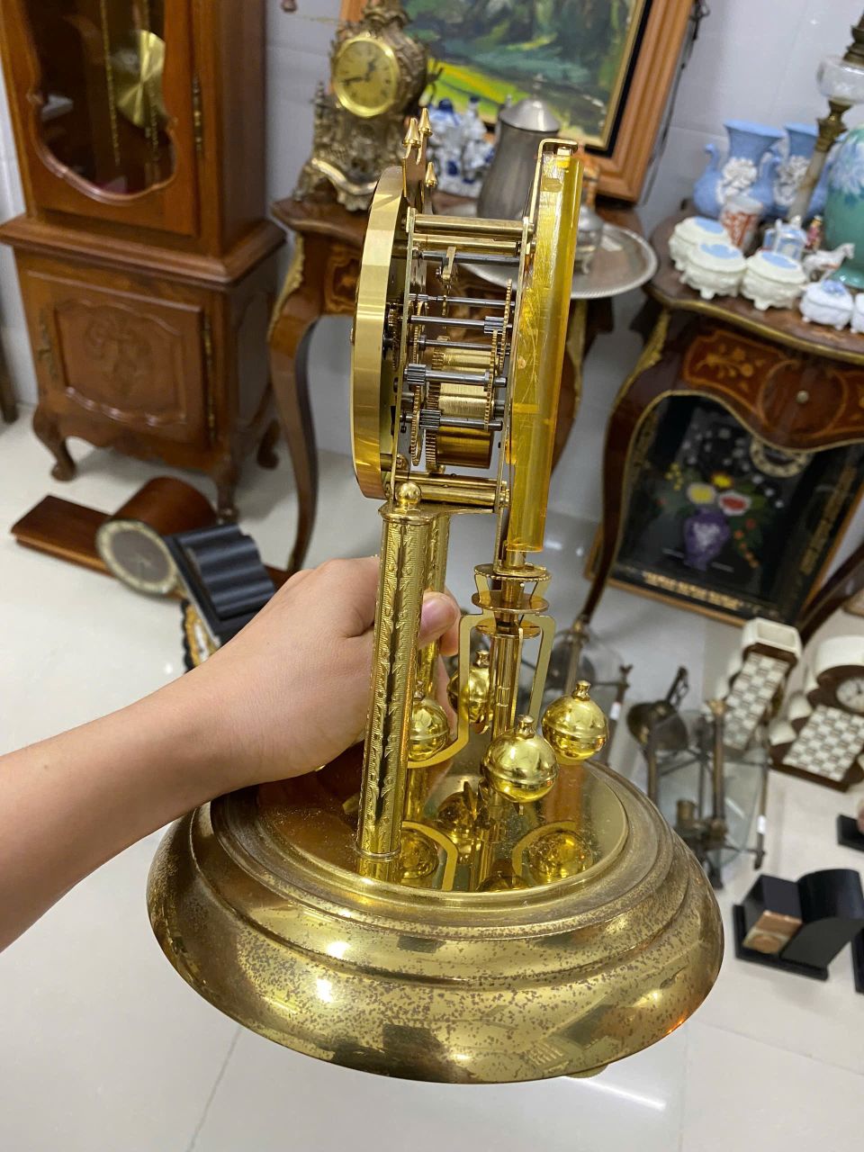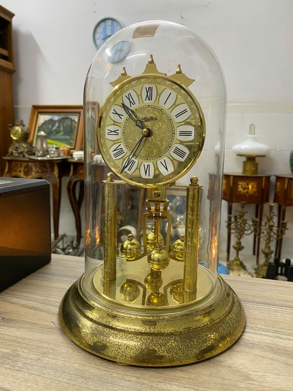 Đồng hồ úp ly thủy tinh Haller Đức cót 400 day1 cót chạy 400 ngày. Quả lắc đảo 2 chiều. C 30cm, N 18cm. Chất liệu đồng. Giá: 2,8tr