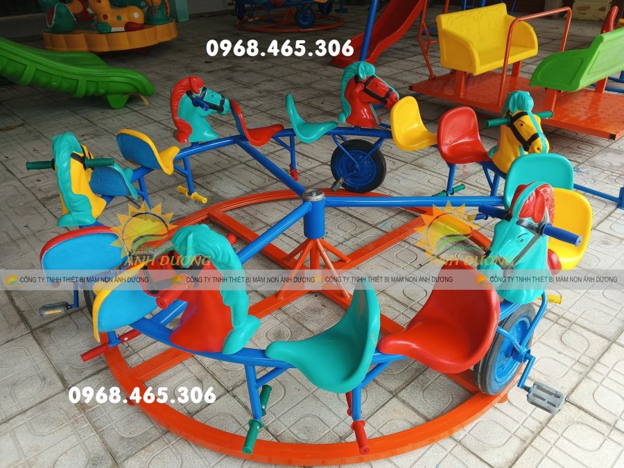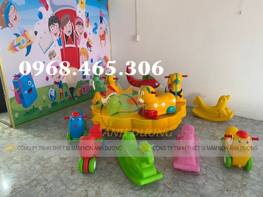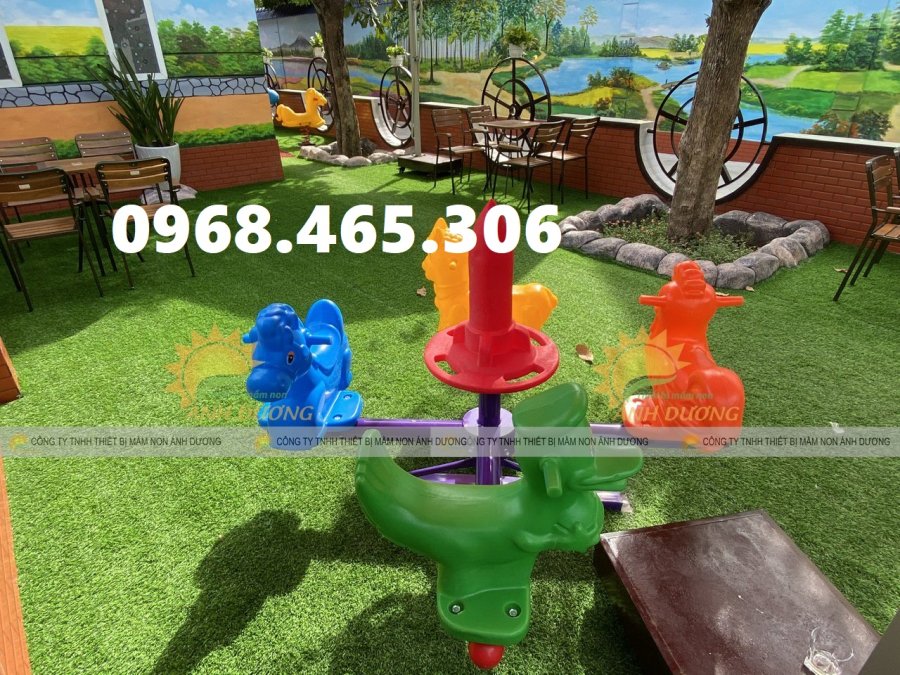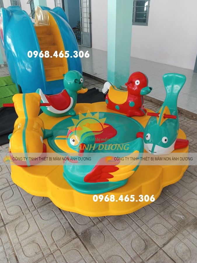 Đu quay con vật: Ghế ngồi được tạo hình thành các con vật ngộ nghĩnh như cá ngựa, voi, hươu cao cổ, thu hút sự chú ý của trẻ. Loại này thường được làm bằng composite hoặc nhựa HDPE, có màu sắc tươi sáng, bắt mắt.