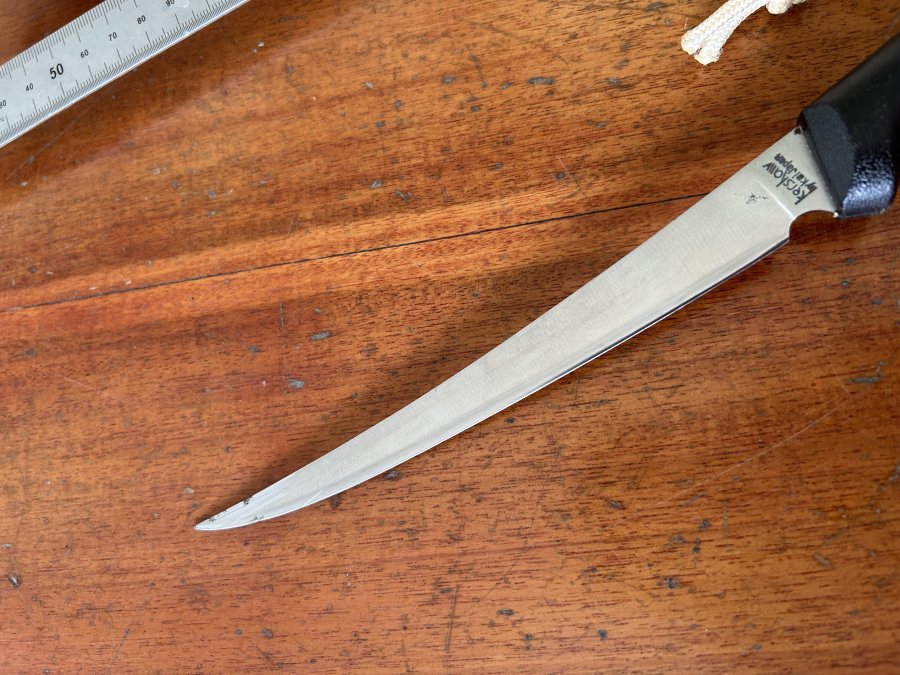 Bán 1 dao Kai Kershaw chuyên làm cá, chuyên lóc thịt cá. Dụng cụ có phần lưỡi sử dụng 16cm, dày 2ly, rất bén. Dao có lỗi tí ngay đầu lưỡi, về mài bóng sạch lại sử dụng