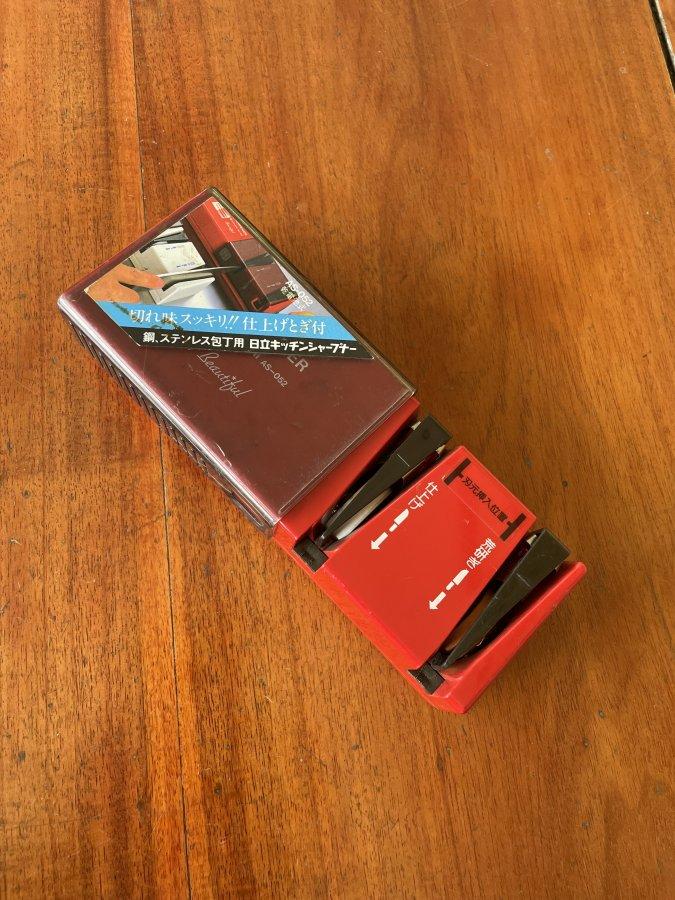 Bán dụng cụ mài dao Hitachi còn khá đẹp, 2 viên đá mài còn mới tinh. Dụng cụ hoạt động hoàn hảo bằng 4 viên pin trung thông dụng, để dao vào nhấn nút PUSH là mài. 2 đá mài, 1 thô 1 mịn. Dụng cụ sử dụng được nhiều loại dao
