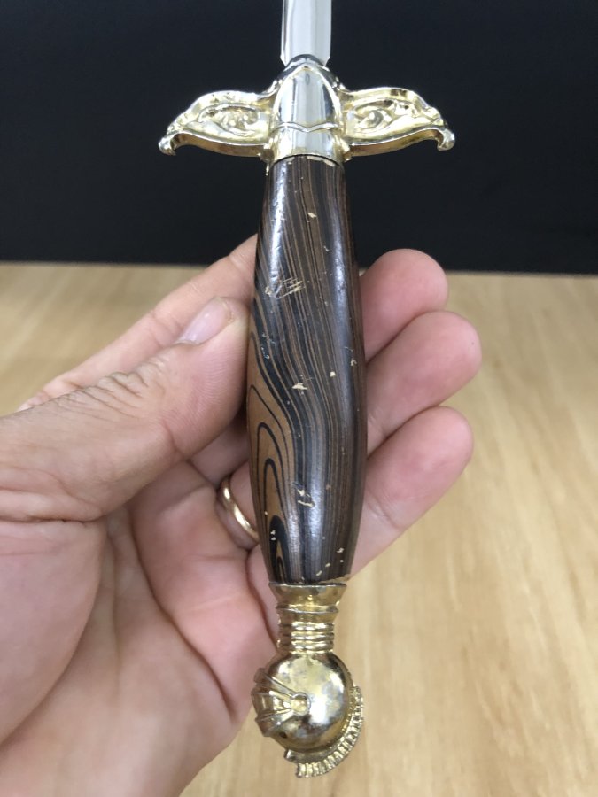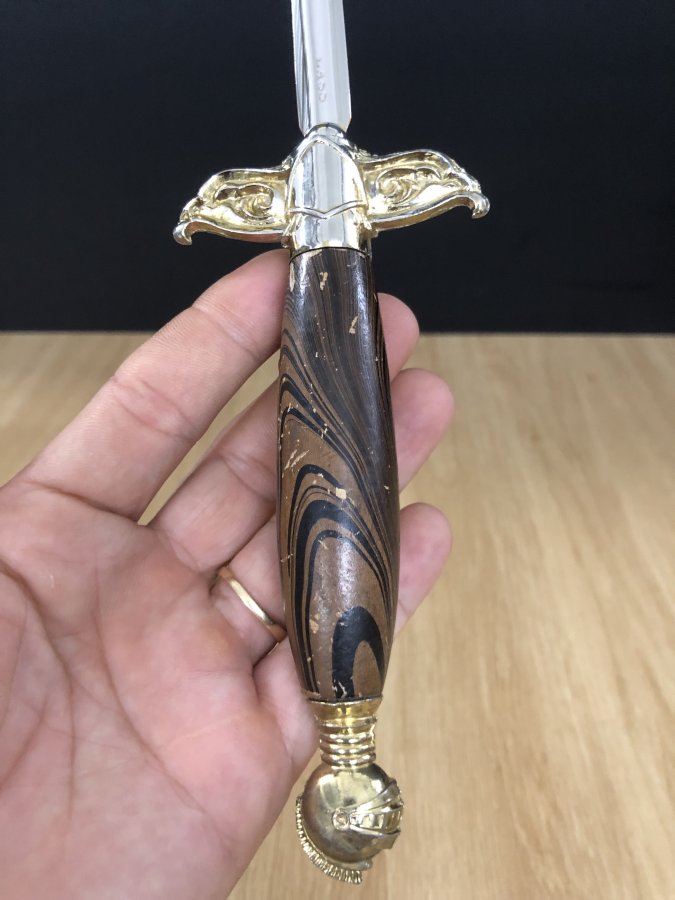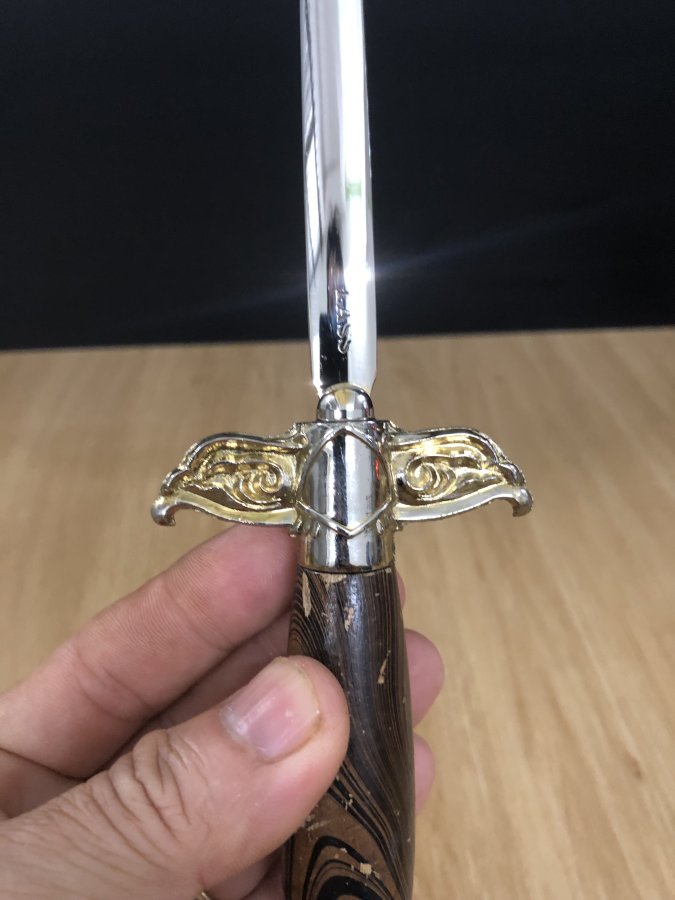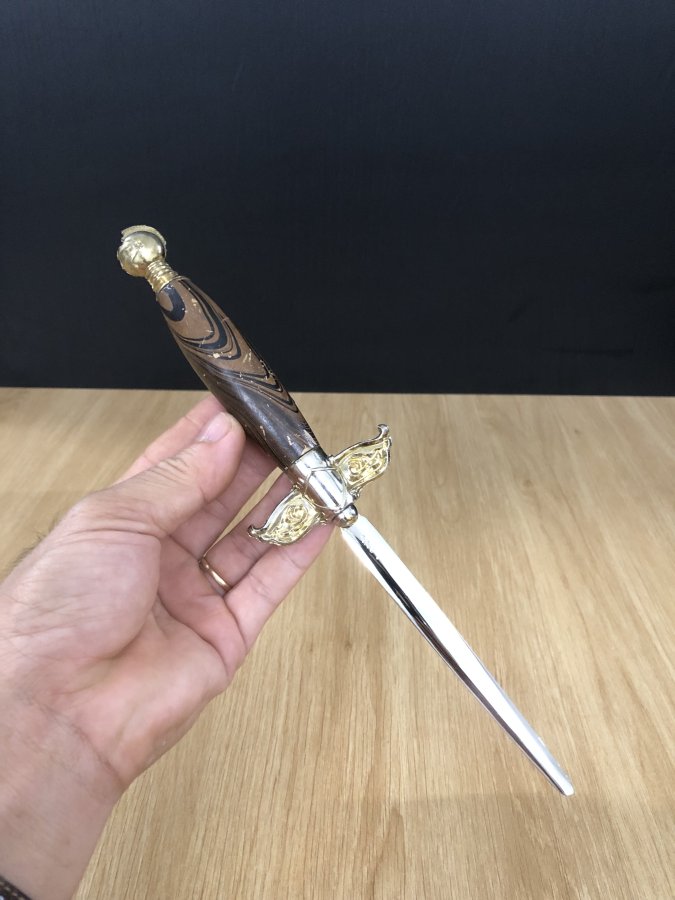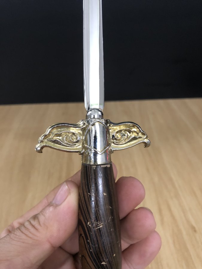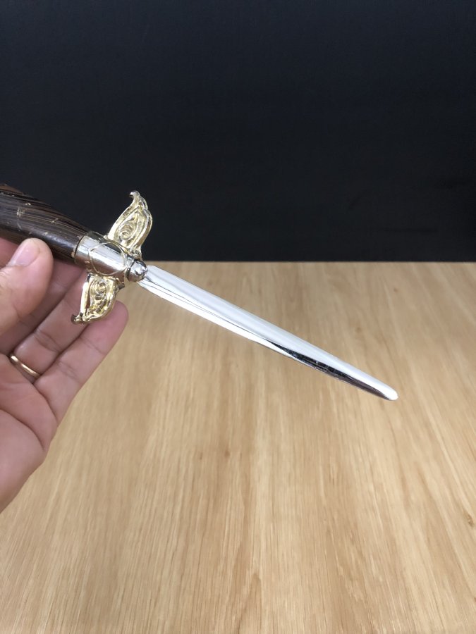 Dụng cụ mang nét cổ điển xưa,lưỡi thép trắng,tay cầm bằng gỗ sơn mài,chuôi gắn mũ sắt chiến binh rất độc đáo.Cảm ơn đã xem tin