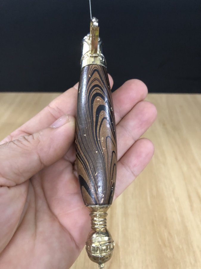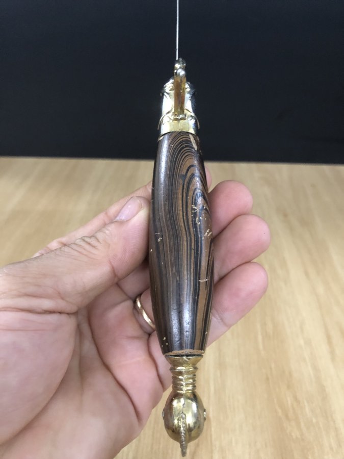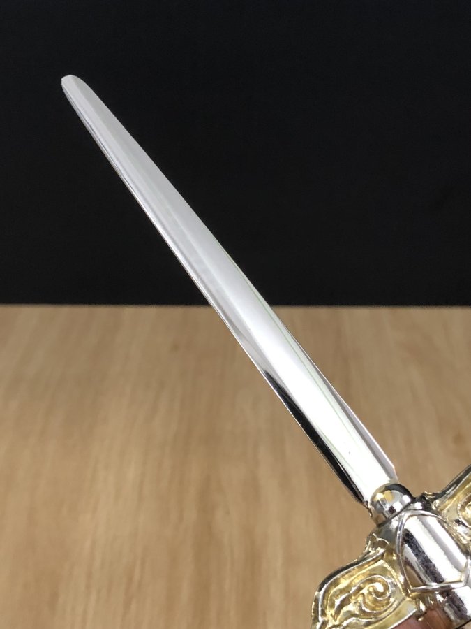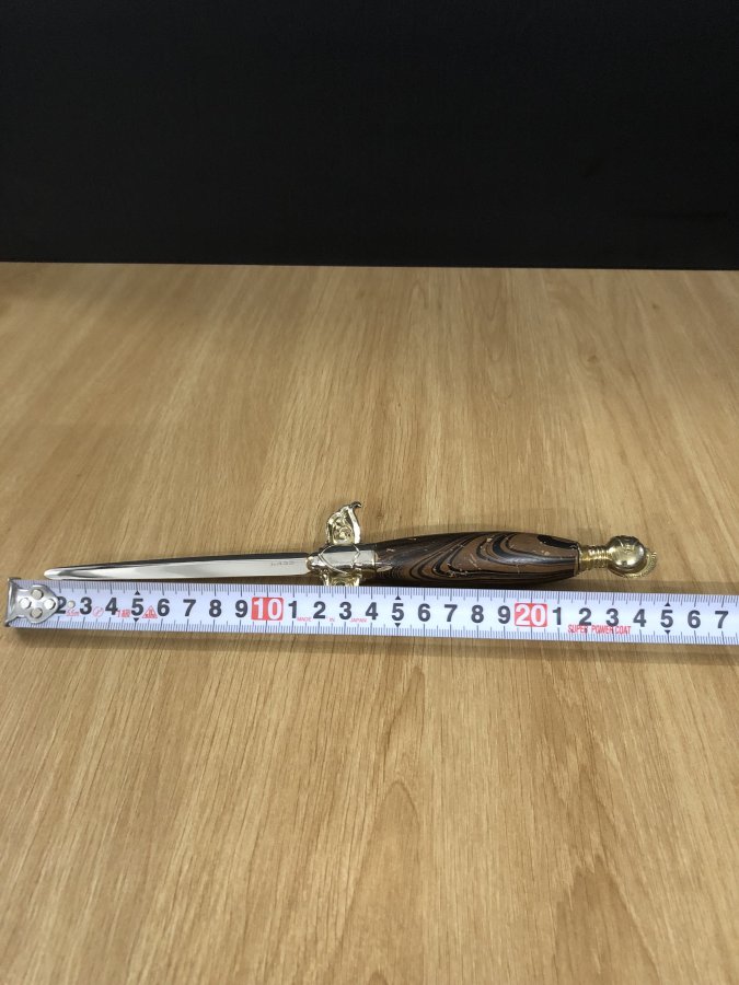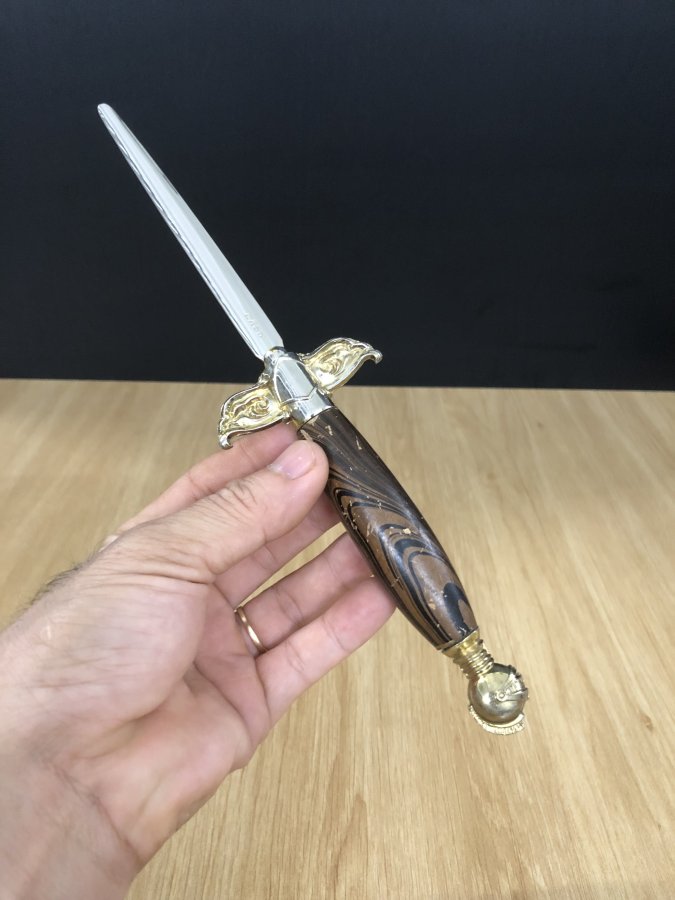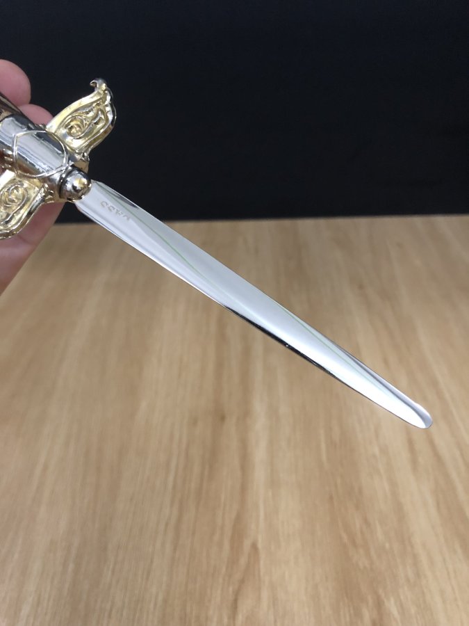 Dụng cụ mang nét cổ điển xưa,lưỡi thép trắng,tay cầm bằng gỗ sơn mài,chuôi gắn mũ sắt chiến binh rất độc đáo.Cảm ơn đã xem tin