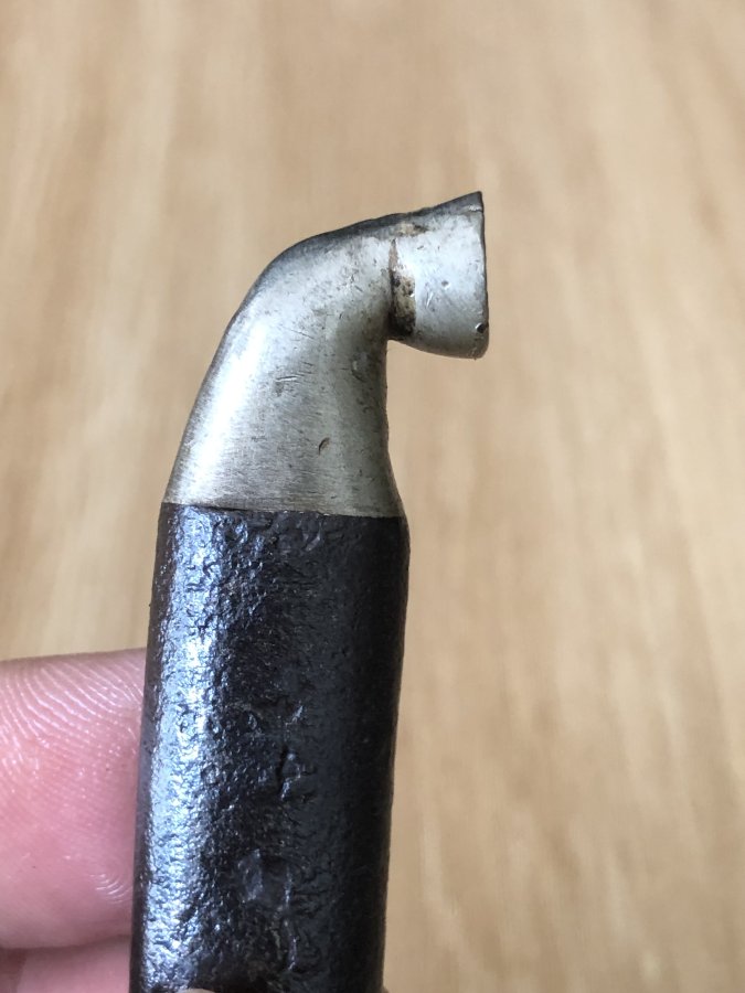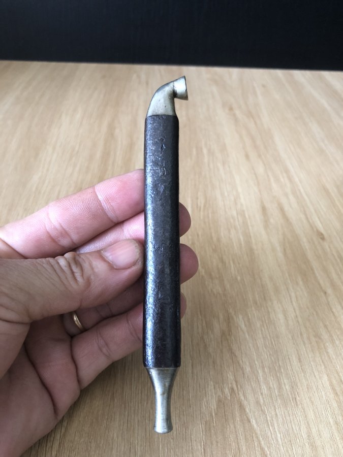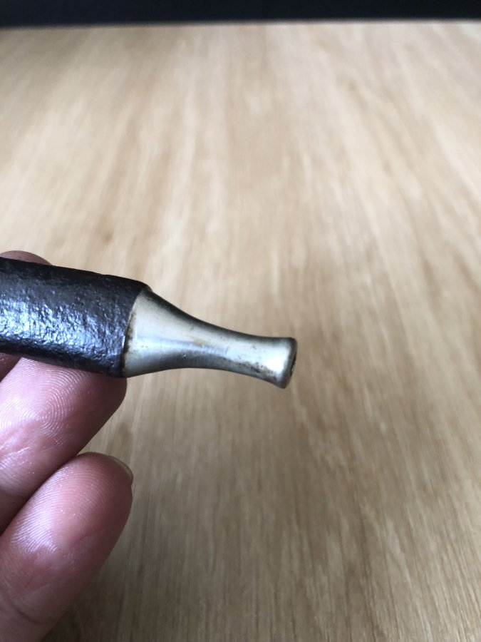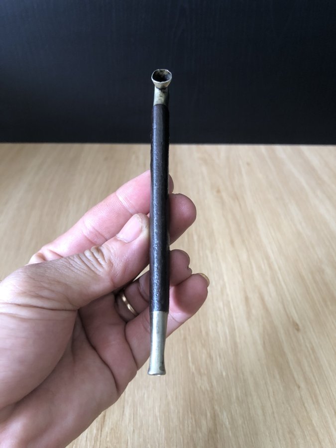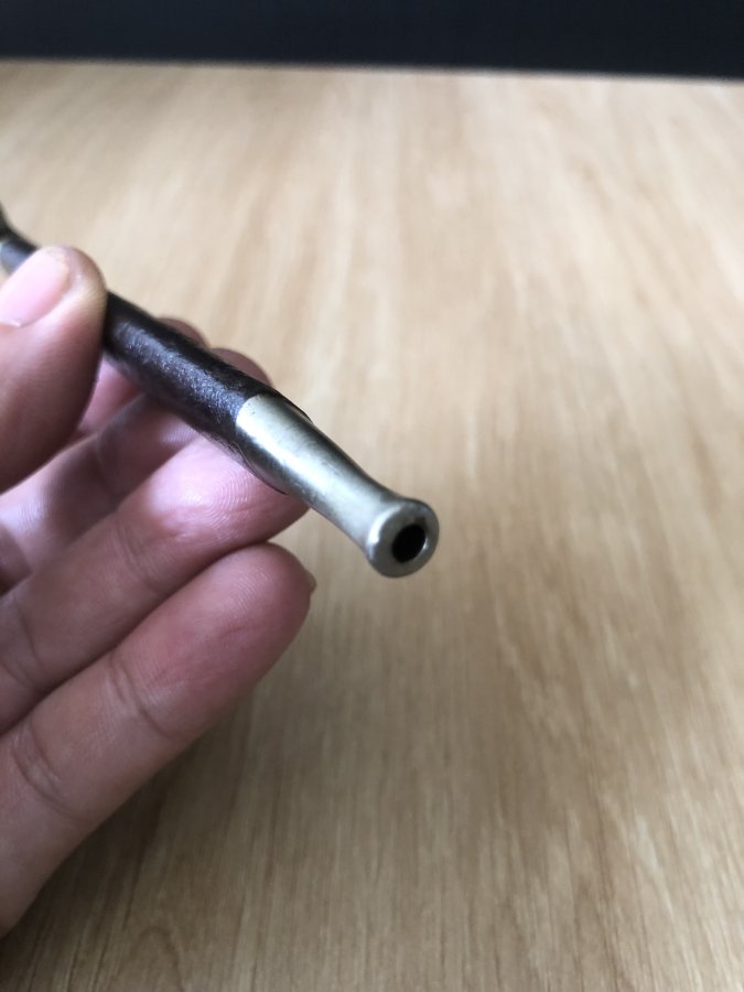 Dụng cụ là 1 chiếc tẩu xưa,thân giữa chất liệu thép được khắc chữ thủ công,2 đầu kim loại không hít nam châm,không gỏ bằng đồng thau hay bạc.Hàng xưa qua thời gian sử dụng và không được bảo quản tốt thân có gổ gỉ,dụng cụ chỉ mang tính chất sưu tầm.Cảm ơn đã xem tin